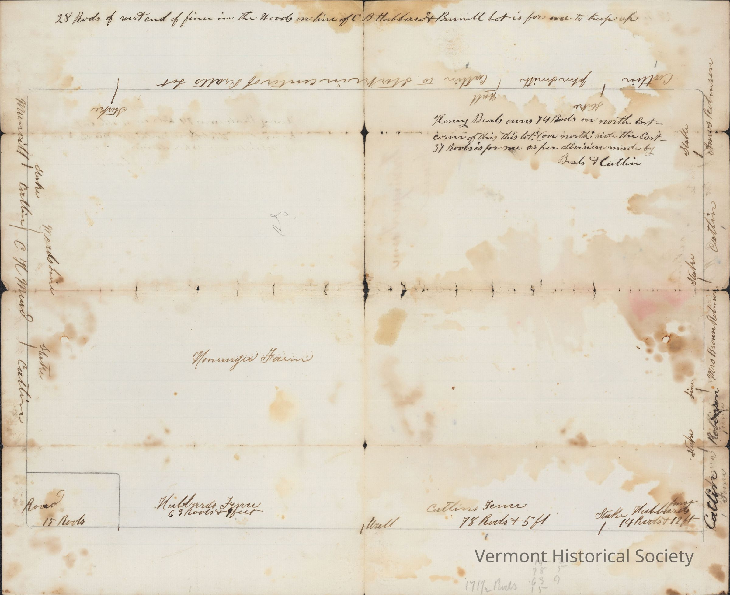 This highly localized manuscript map was originally contained in an account book belonging to Moses Catlin, likely the neighbor Catlin marked on one side of the map. It maps the boundaries of one family's farm, noting neighbors, natural resources, roads, and other relevant information.