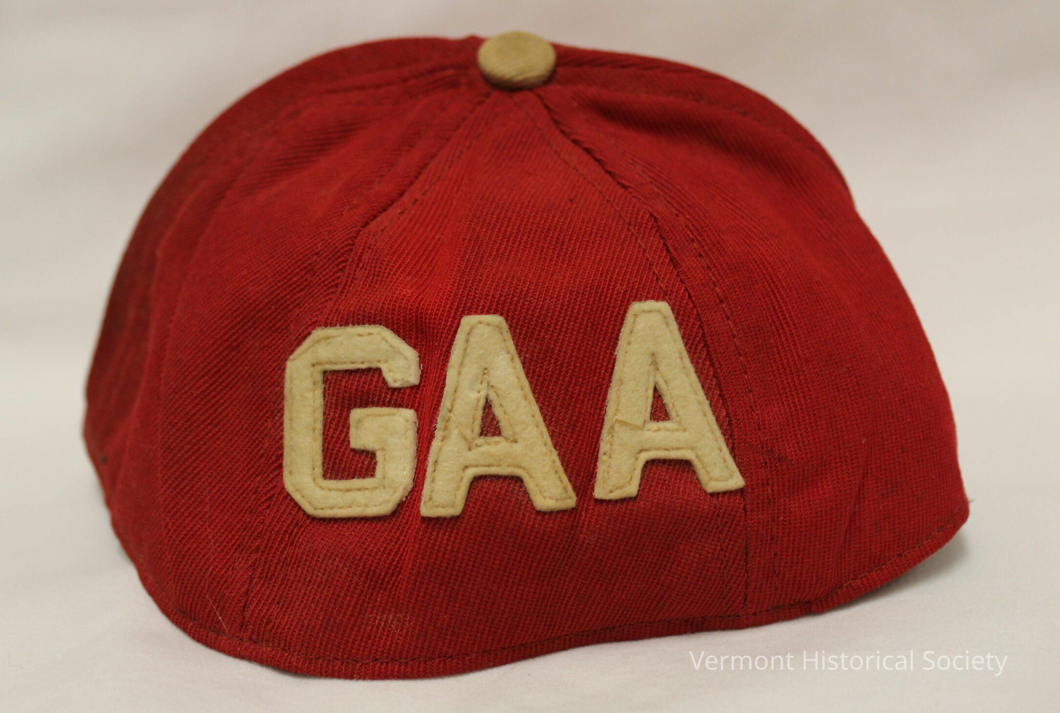 Red twill-woven cotton cap appliqued in white felt with the letters, "GAA". The cap is formed from 6 triangular gores with a white button at the center. The interior is unlined, and the seams are covered with red bias tape. The edge is faced with red grosgrain ribbon.