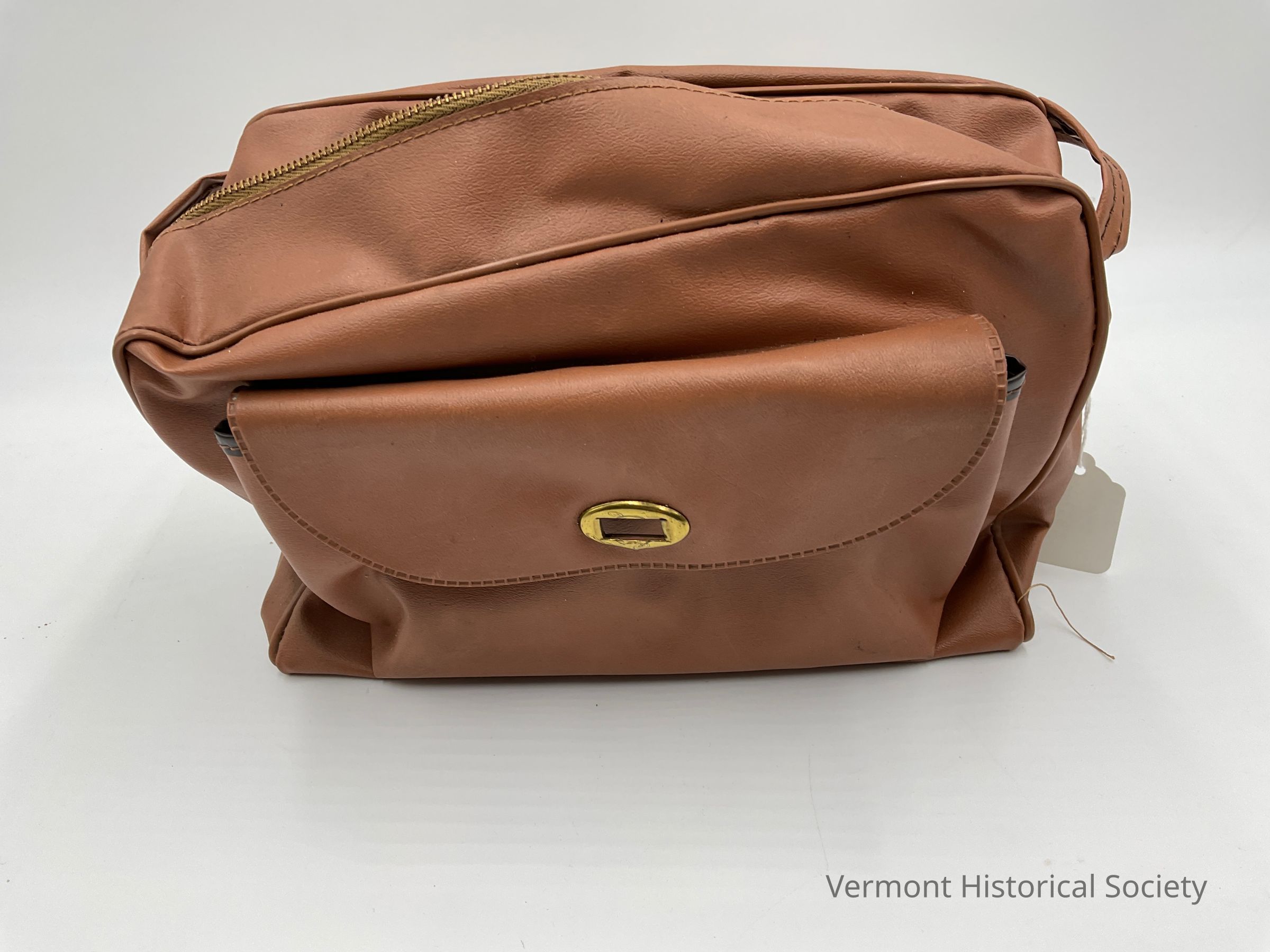 Brown vinyl camera case with outside compartment that closes and a zipper to close the larger carrying space. It also has a long shoulder strap