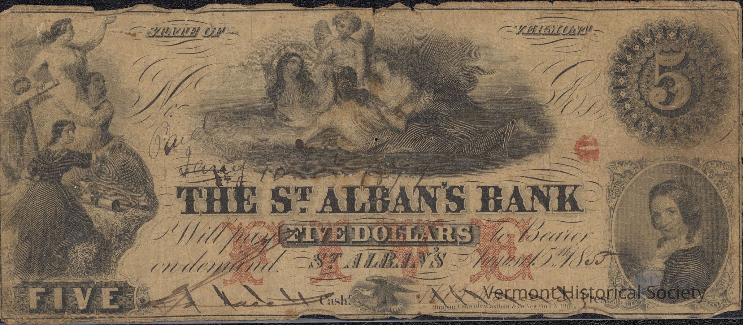Private bank note for 5 dollars from The St. Alban's Bank. The serial number is left blank, and it is dated August 15th, 1855. There is a handwritten note on the front that reads, "Paid Jany 10th 1877," and the signatures have been crossed out by repeated diagonal lines.