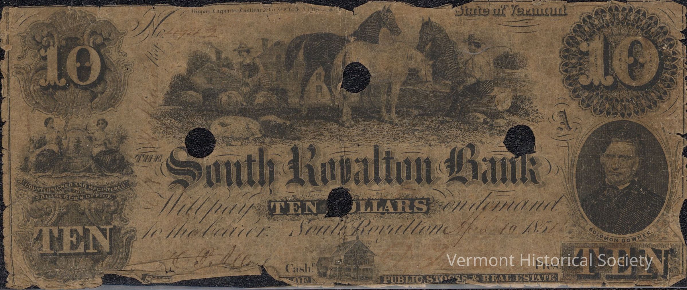 Private bank note for 10 dollars from The South Royalton Bank. The serial number is 4743, and it is dated April 10, 1851. There are 4 circular holes in it.