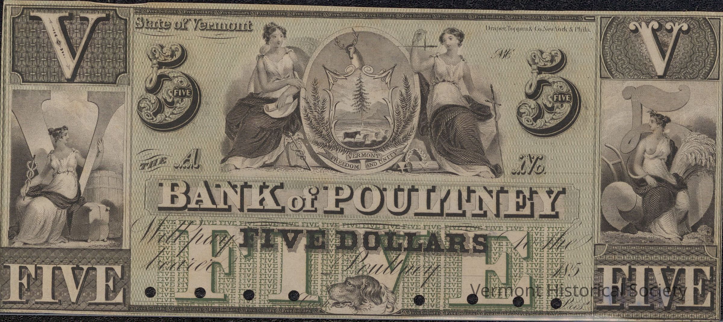 Private bank note for 5 dollars from The Bank of Poultney. It is unfilled and unsigned. The center ground is printed with a repeating linework pattern, giving the bill a green appearance. There are circular holes along the bottom.