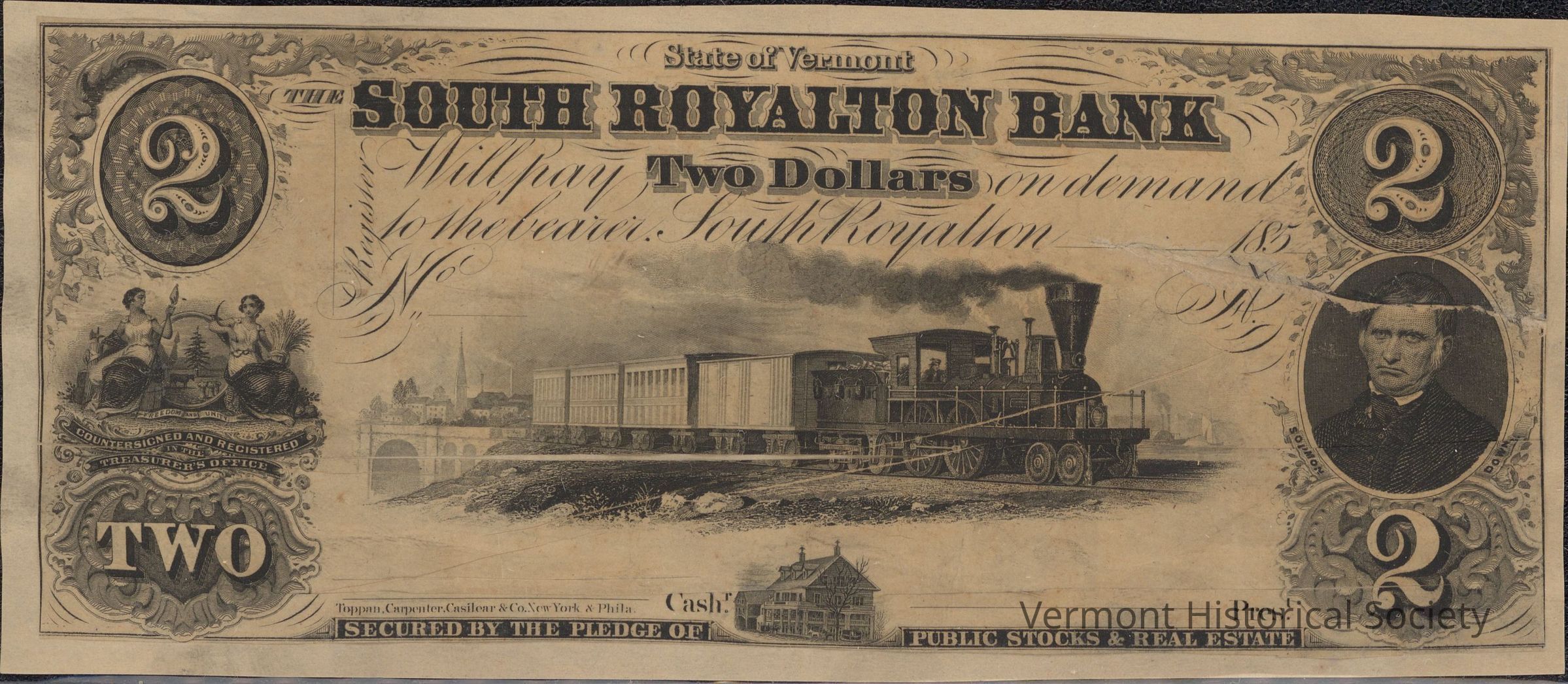Private bank note for 2 dollars from The South Royalton Bank. It is unfilled and unsigned.