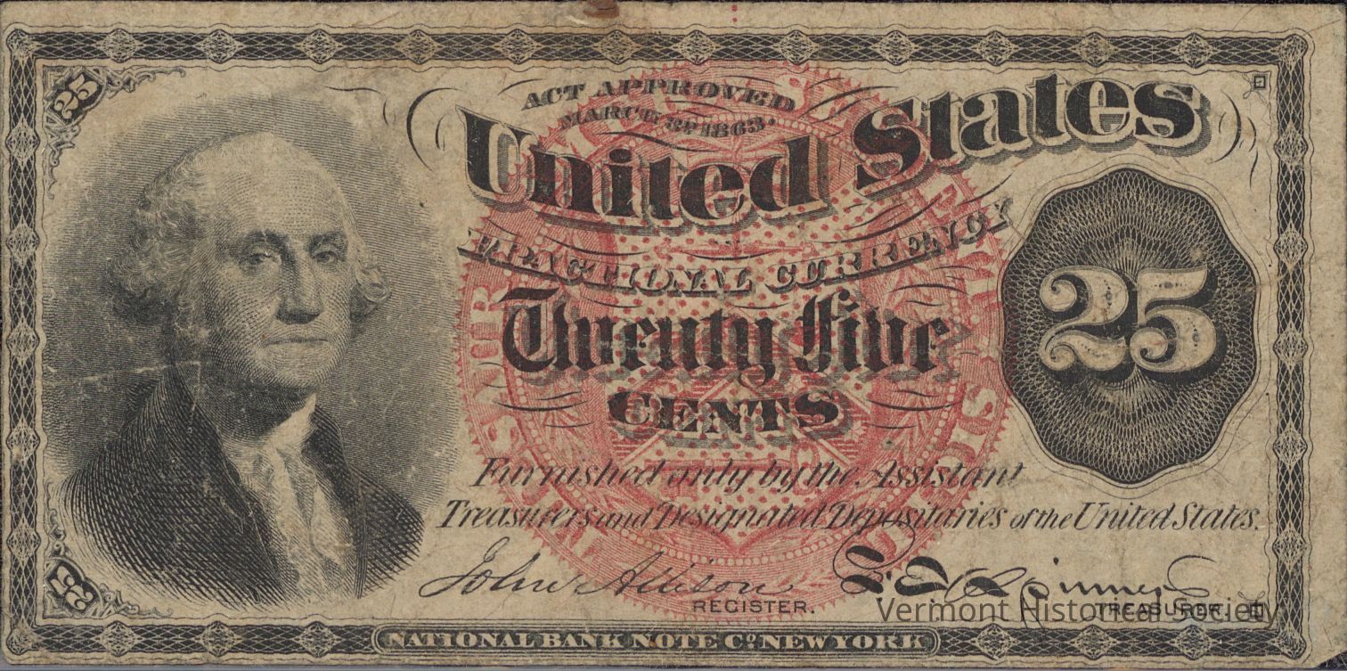 United States paper money for 25 cents. It is printed with a portrait bust of George Washington.
