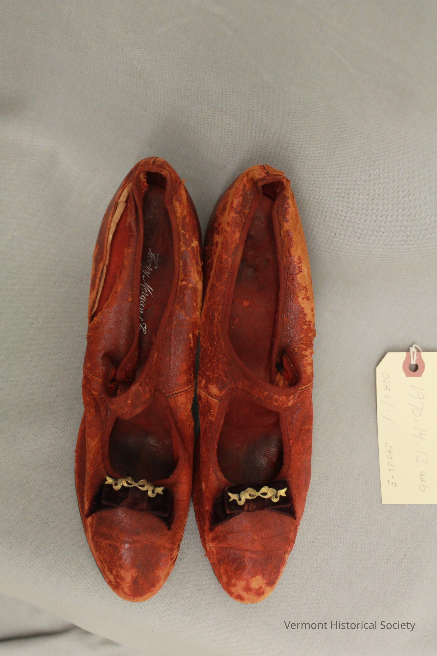 These red leather Mary Jane shoes have a button closure. At the toe, there is a red velvet bow adorned with gold embroidery. The shoe style is characterized by a classic heel, resembling a pump, and the soles are crafted from leather. The insole bears the inscription "Henry Morgan & Co. MONTREAL, P. Q."Acquisition