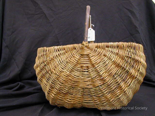 Round-bottomed basket made with pine roots and branches. There is a stationary wooden handle across the top.