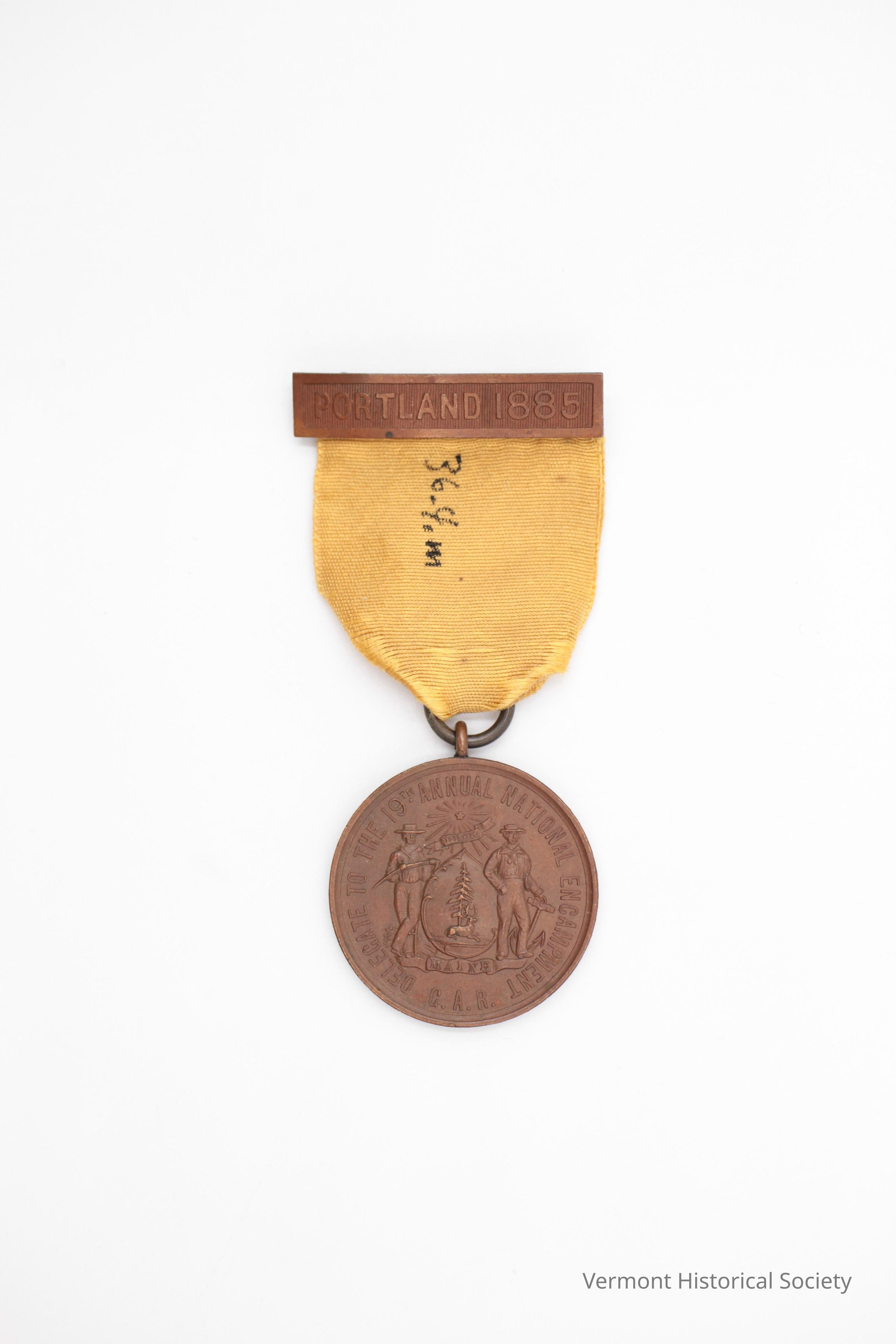 Membership ribbon consisting of a rectangular bar, a yellow ribbon, and a round medallion. The bronze bar has the inscription "PORTLAND 1885" and has a hinged pin on the reverse. A yellow grosgrain ribbon is looped and stitched onto a wire on the back. From an eye hook looped through the bottom of a ribbon hangs a round bronze medallion molded with the coat of arms of Maine and the inscription, "DELEGATE TO THE 19TH ANNUAL NATIONAL ENCAMPMENT G.A.R." The back of the medallion has the seal of the Grand Army of the Republic inside a laurel wreath.