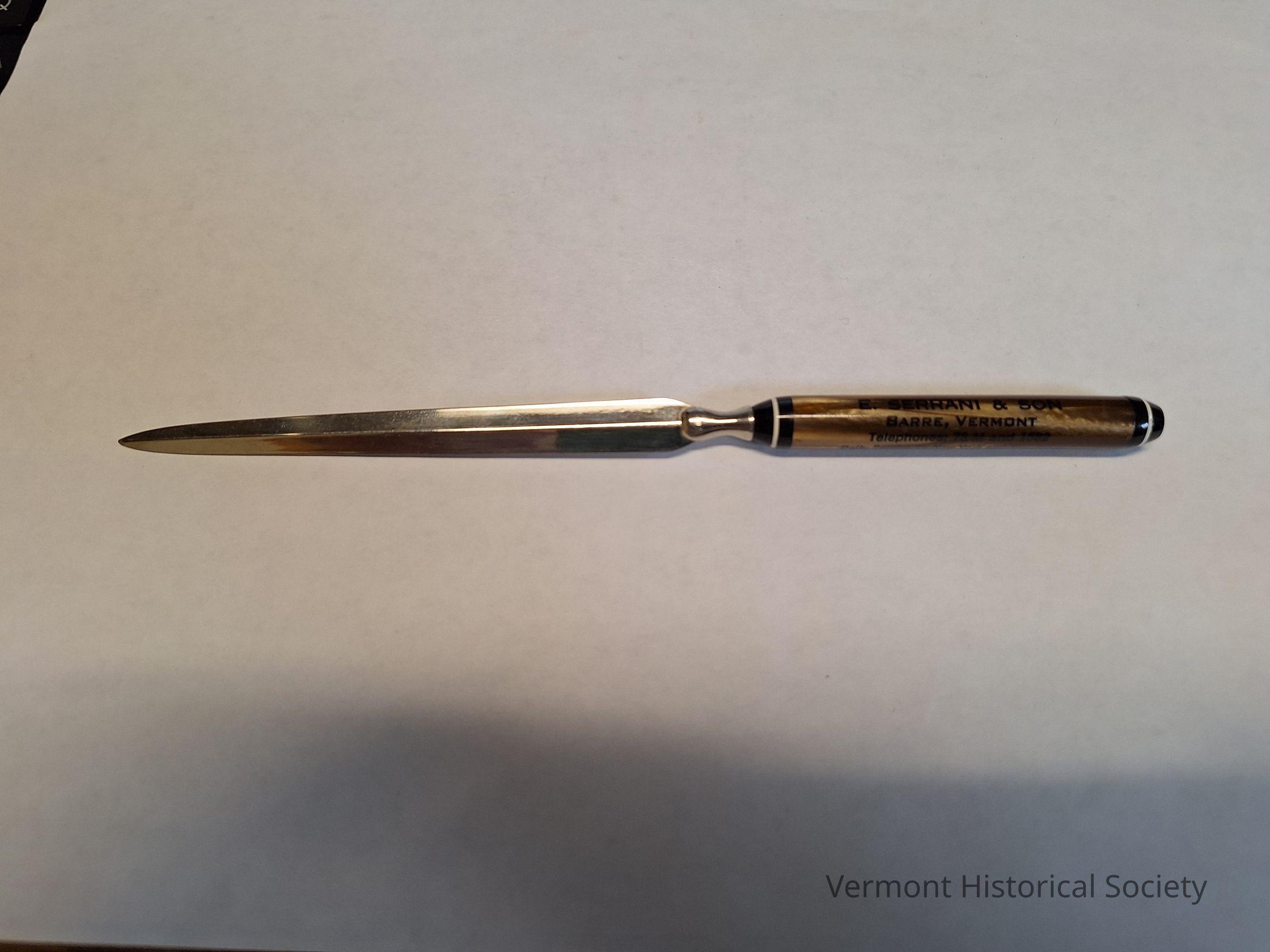 Letter opener. The blade is a thin piece of metal that tapers to a point at the end. The round handle is polished brown plastic to look like faux wood grain and has bands of black and white stripes on either end. Printed on the handle are the words, "E. SERRANI & SON / BARRE, VERMONT / Telephones: 78-M and 1582 / Daily Services to New York and New Jersey" in black.