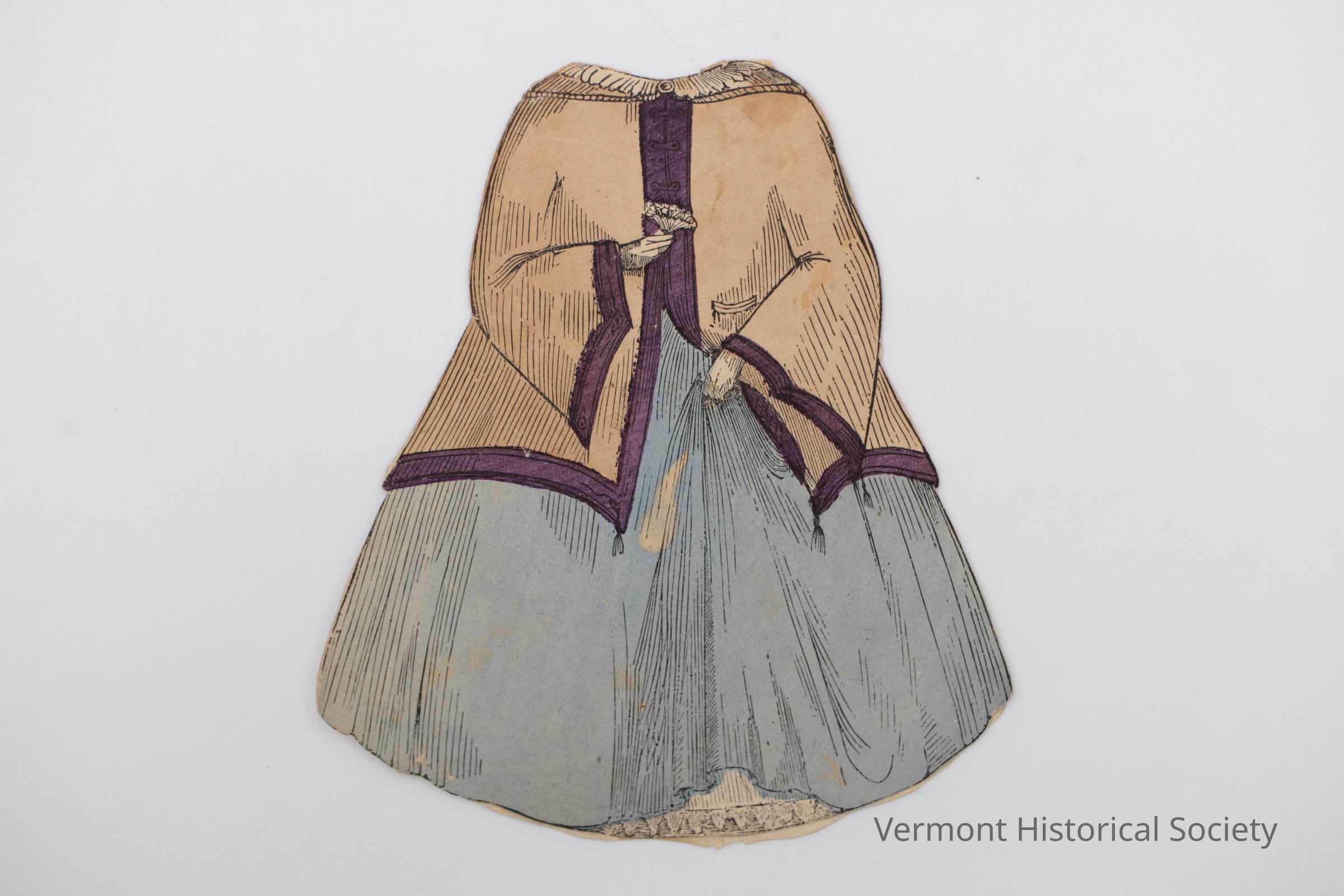 Double-sided paper doll dress. The dress has a blue skirt with a brown loose coat over the top. The right hand is holding a spray of flowers, and the left hand is holding up the front of the skirt. The reverse shows the back of the same dress. The two pieces are connected at the upper shoulders to slide over the doll. The back of the front piece (inside) is labeled in pencil, "Minnie Bennet Carriage dress".Acquisition