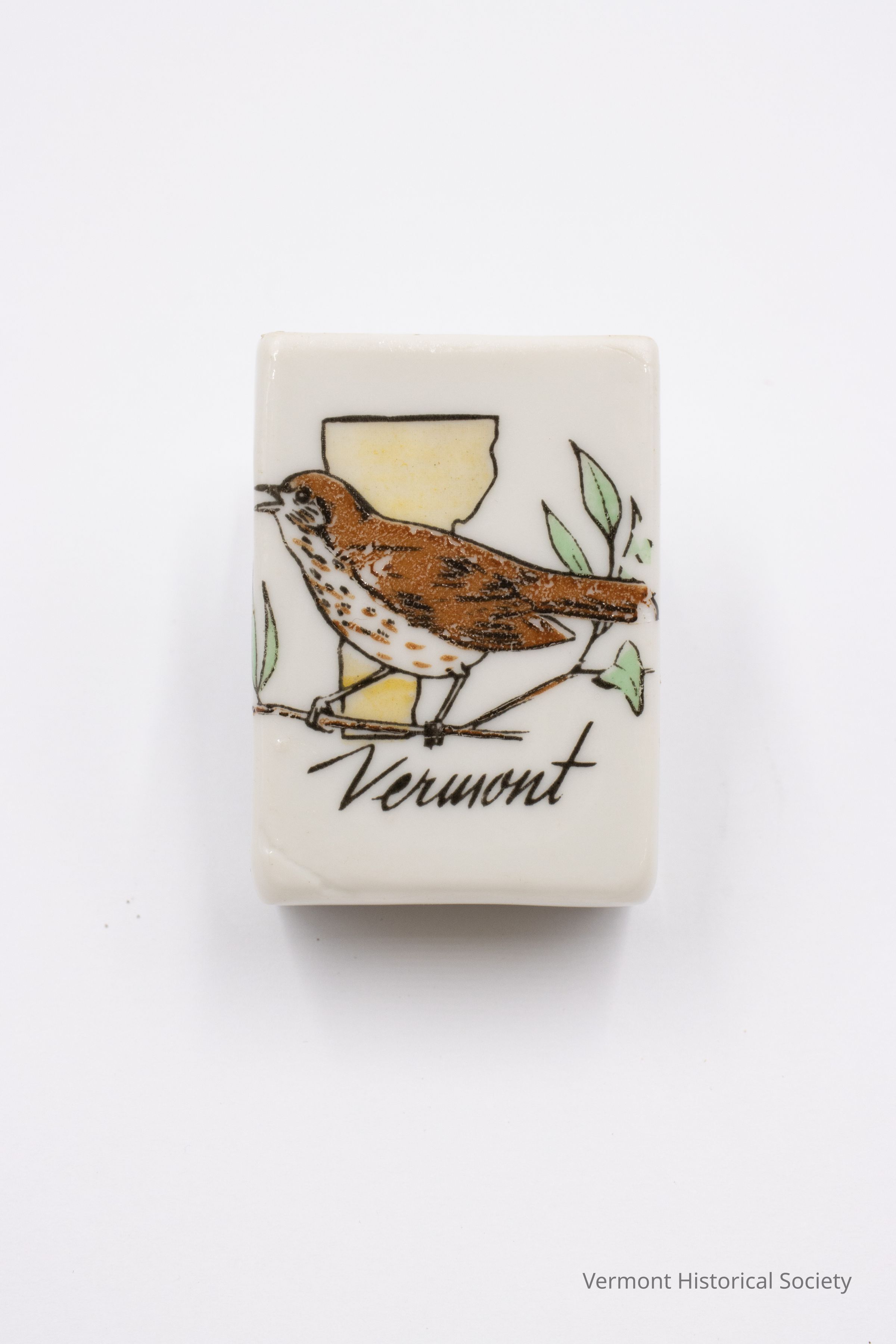 White ceramic matchbox cover printed on one side with the image of a hermit thrush over a silhouette of the state of Vermont. The word, "Vermont", in decorative script runs along the bottom. The top is open for inserting a matchbox, and there is an oval hole in one side to allow the striking strip to be accessed.