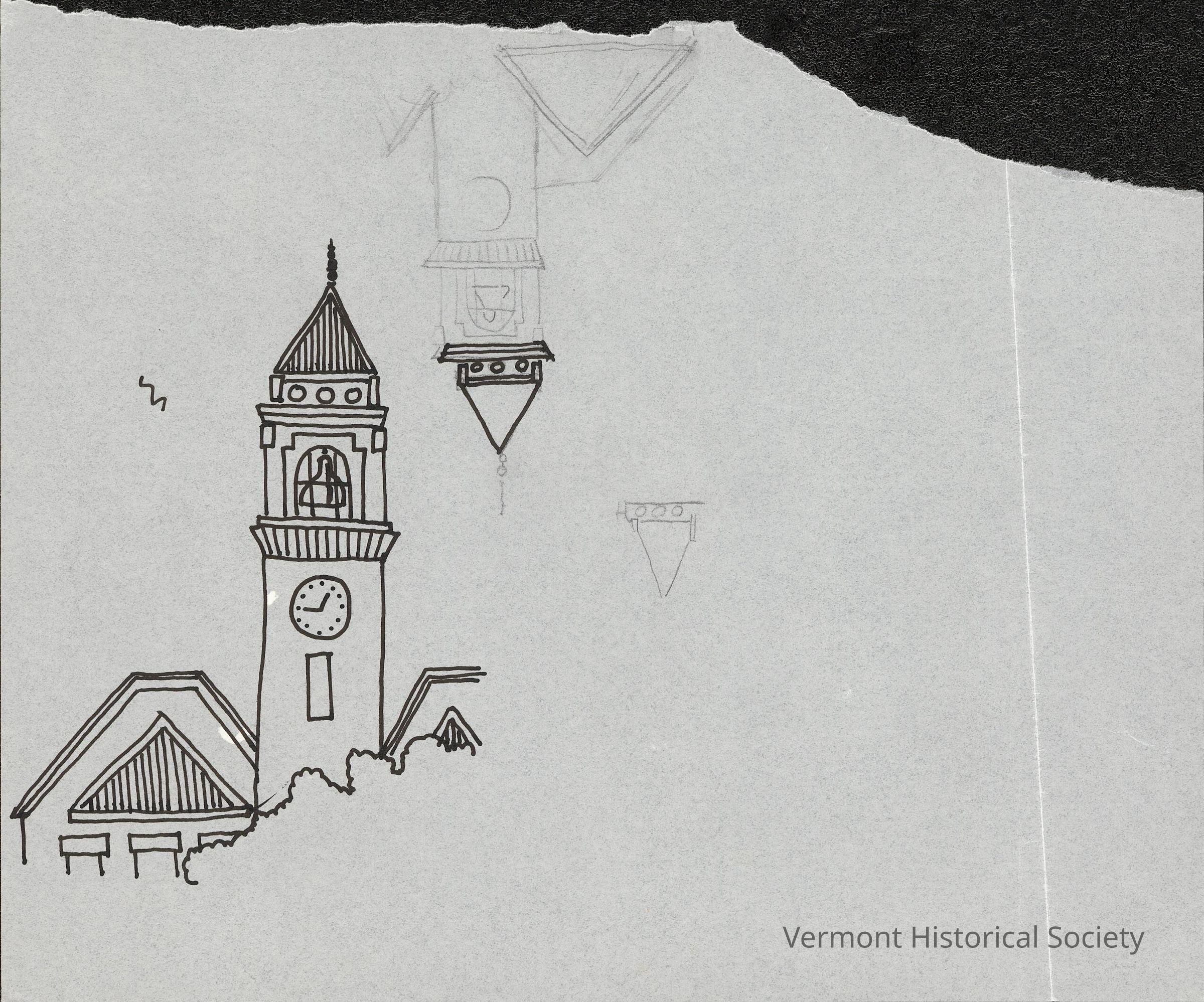 Pencil sketch and inked line drawing on tracing paper. Both drawings show the same tower, but are oriented opposite each other. They show a tower with a pointed top, a bell, and a clock, above two roofs and a treeline.Type of Drawing