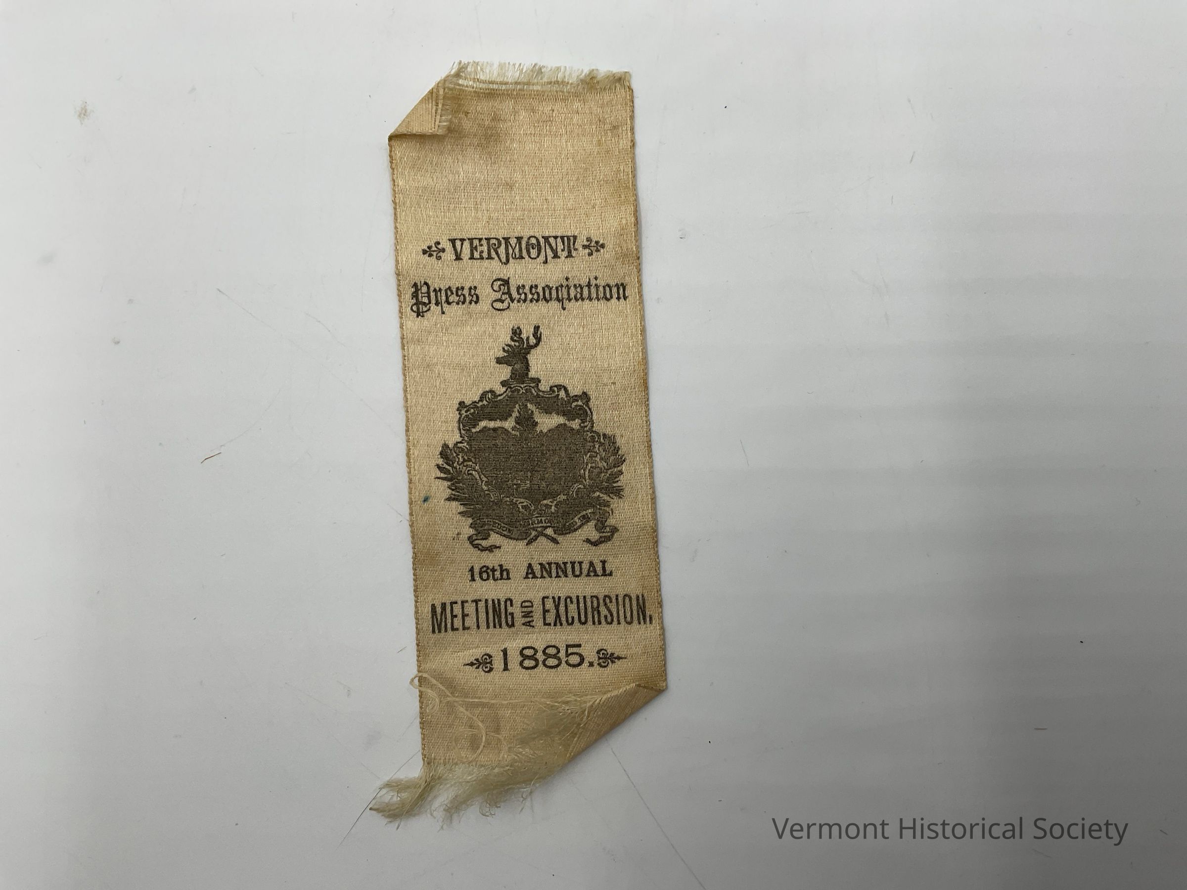 White ribbon with black lettering and image of the state seal. The words printed on the ribbon are, "Vermont Press Association, 16th annual meeting and excursion, 1885."Acquisition