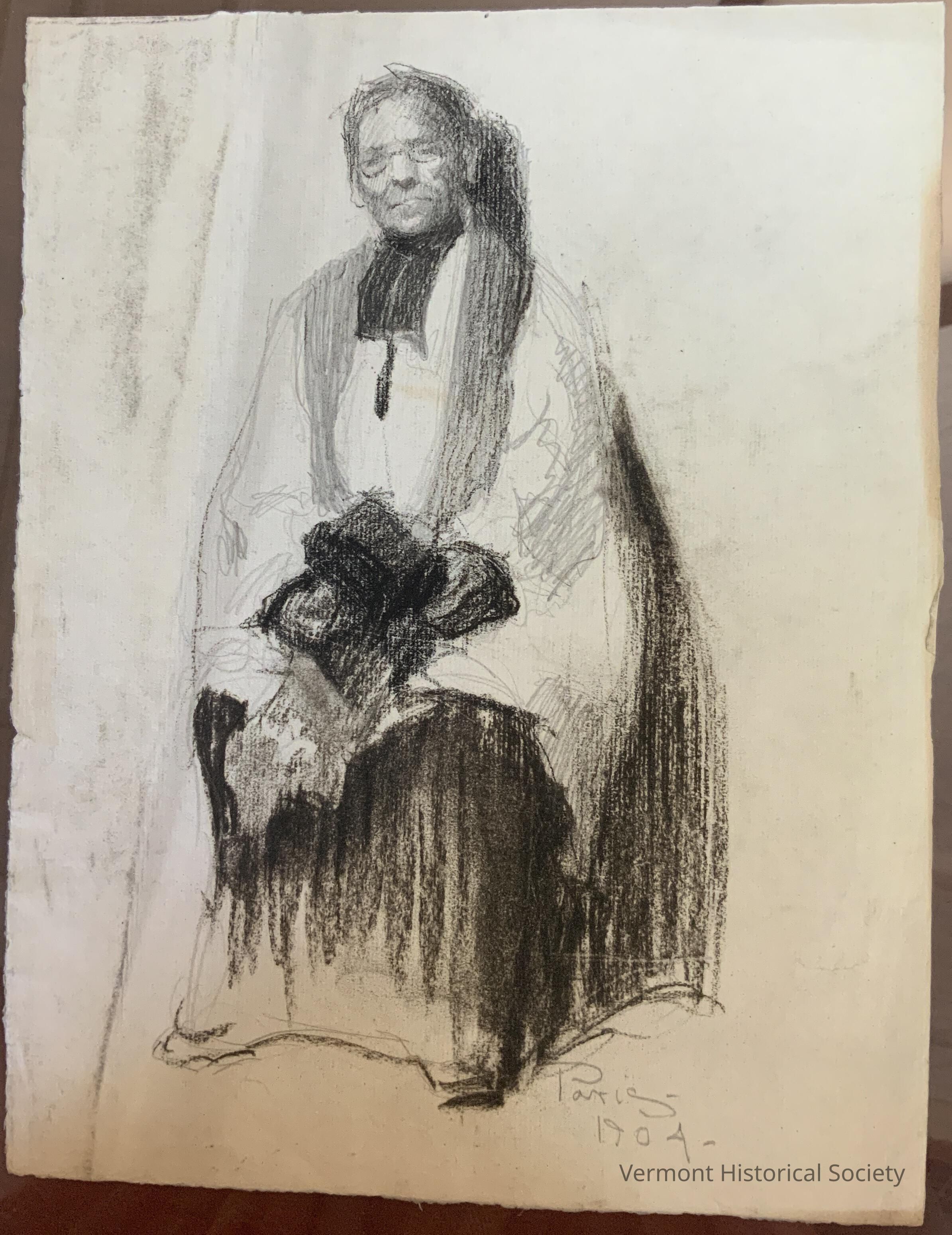 A drawing of a clergyman sitting against the wall and holding his cap in his hands. He wears glasses and robes. There is some graphite detailing among the charcoal. Signed only with “Paris 1904.”Type of Drawing