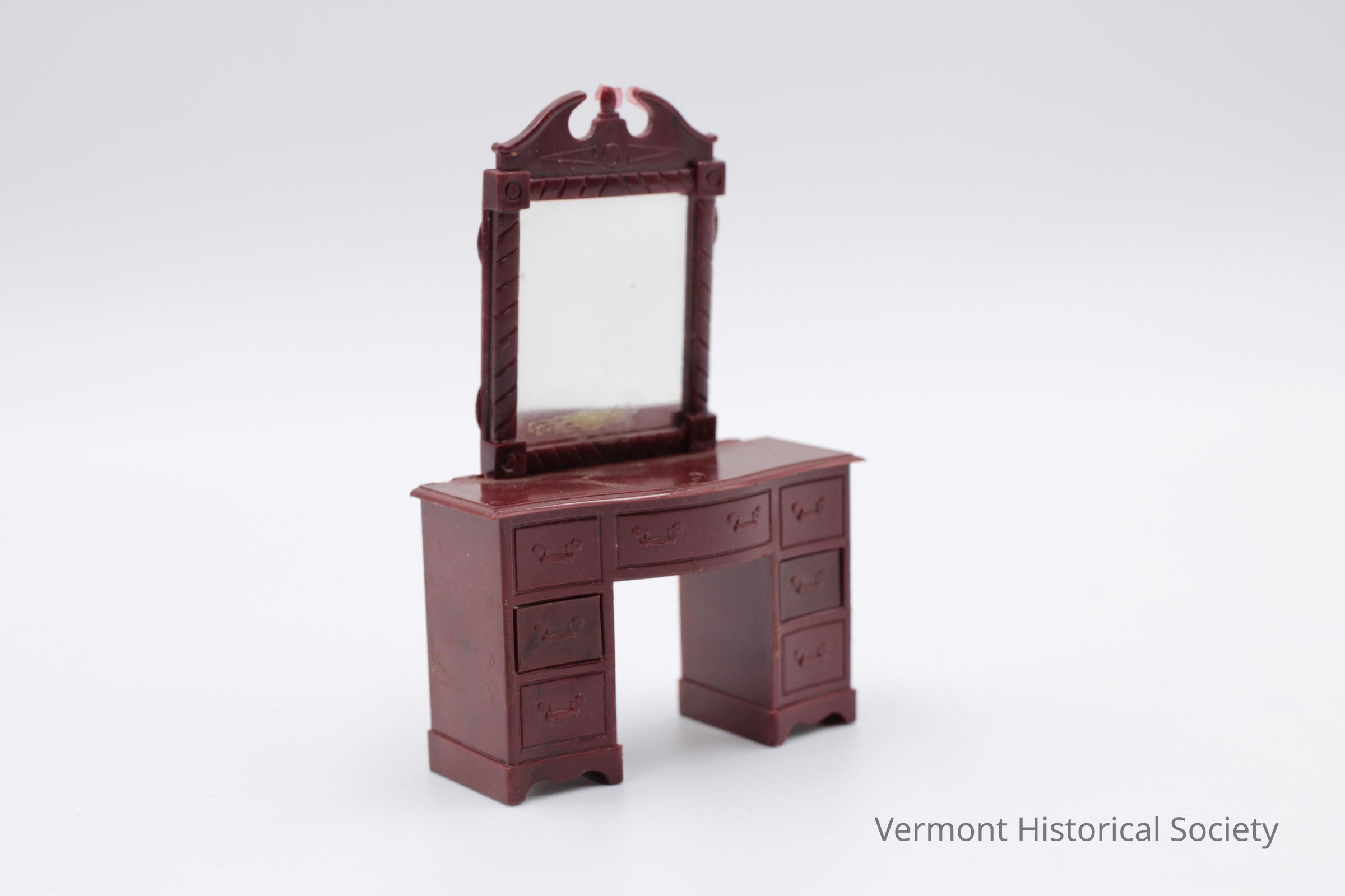 Miniature dressing table sized for a dollhouse. It is made of brown plastic. The base has an opening at the center for a sitter, with three drawers front down each side and one at the center top. The middle drawer on each side opens. There is a mirror at the back that is framed with decoratively molded brown plastic in a federal style. The mirror front is glass.Context
