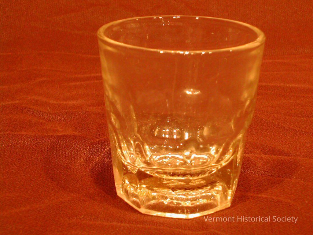 Clear whiskey glass. The whiskey glass has a thin rim on a slightly flared body and circular mouth that leads down into multi-faceted indentations around the bottom of the bowl and base. The heavy base of the glass has a hollowed arch on the bottom that mirrors the curve of the bowl.