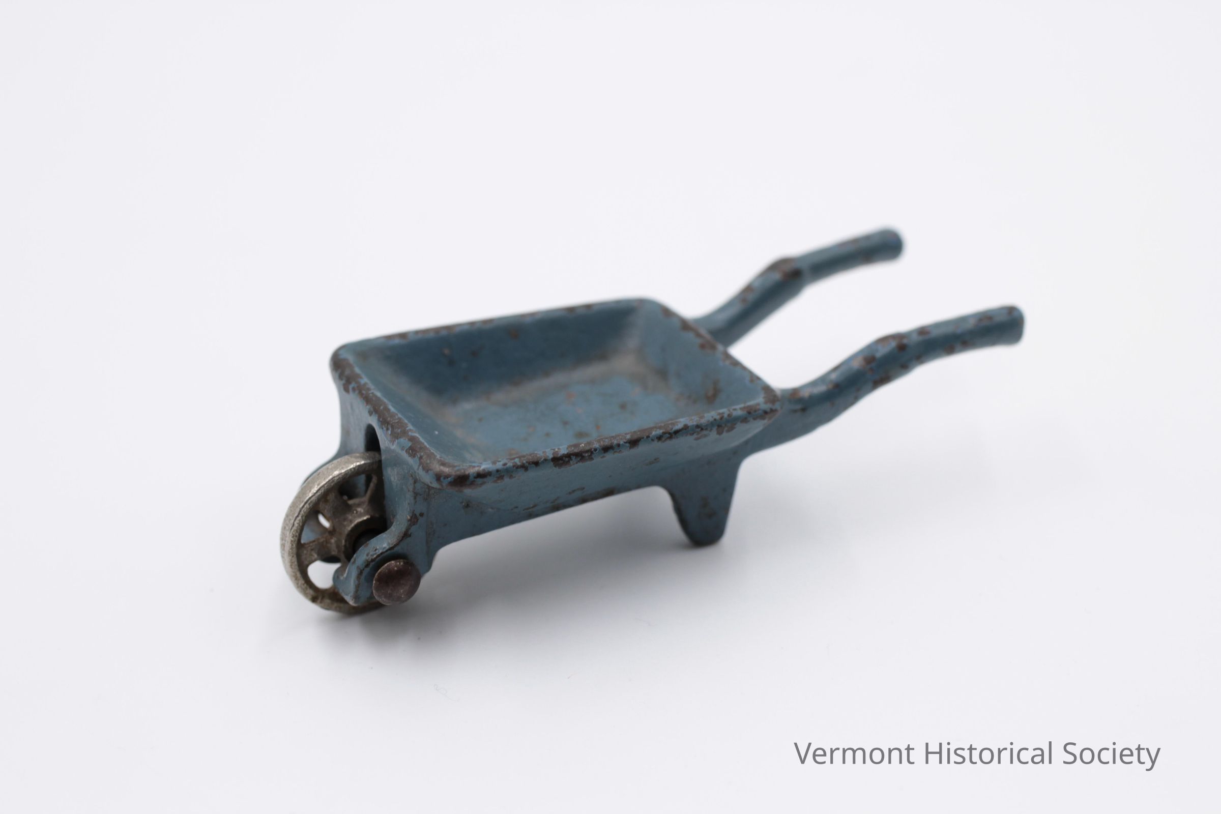 Miniature wheelbarrow sized for a dollhouse. The wheelbarrow is made of cast iron and painted blue. There is an unpainted wheel at the center front. The wheelbarrow has a rectangular bed, two handles protruding from the back, and two supports on the back end.Context