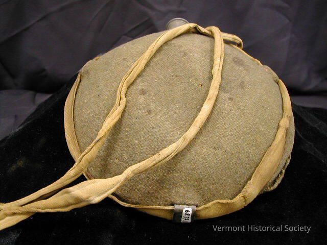 Round metal canteen covered in plain-woven wool. There is an attached cotton shoulder strap. The spout of the canteen is at the center top, and there is no stopper.