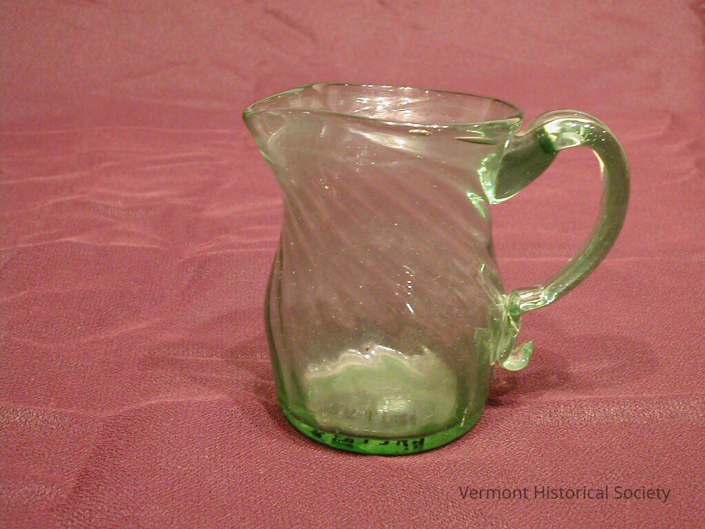 Small green glass pitcher with twisted blown pattern and applied handle.