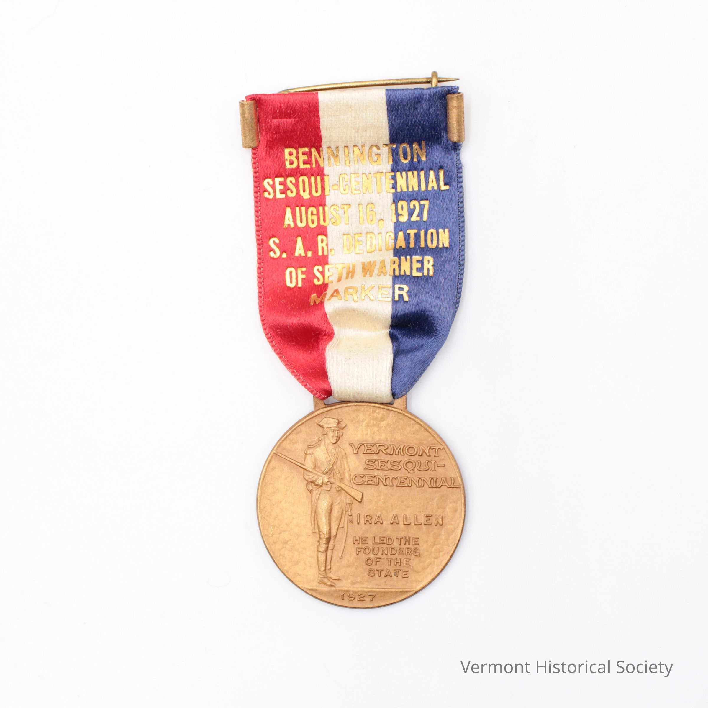 Round, gold medal hanging from a red-white-and-blue striped ribbon. The top of the ribbon is attached to a spring-backed pin. The ribbon is printed in gold with the inscription, "BENNINGTON SESQUI-CENTENNIAL AUGUST 16, 1927 S. A. R. DEDICATION OF SETH WARNER MARKER". The front of the medal is molded with an image of a Revolutionary War soldier slouching and holding a long gun in one arm. To his right is the inscription, "VERMONT SESQUICENTENNIAL / IRA ALLEN / HE LED THE FOUNDERS OF THE STATE / 1927". The back of the medal is marked, "THE WHITEHEAD & HOAG CO. NEWARK, N.J." The medal is held onto the ribbon with a metal crimp.Context
