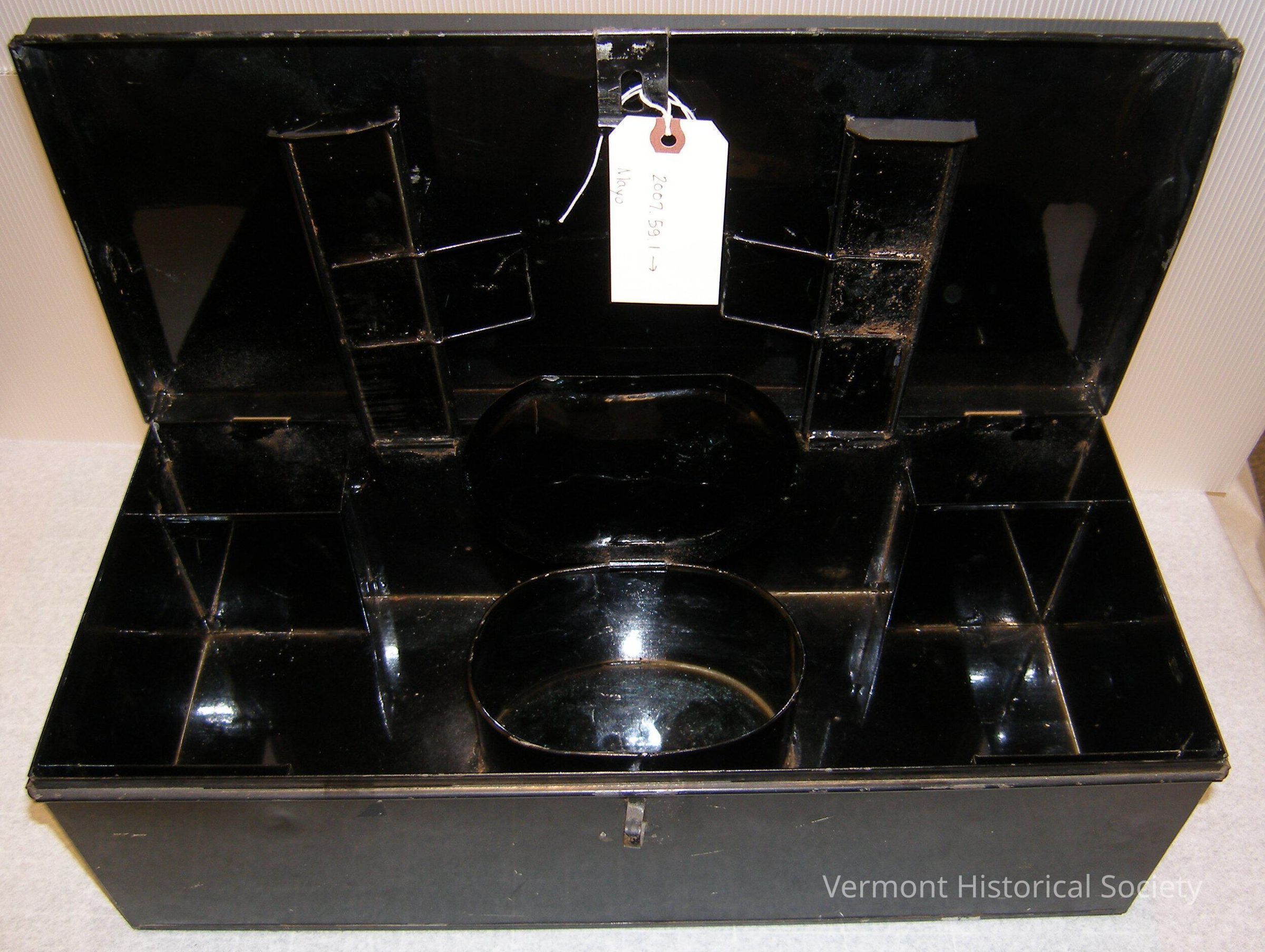 Hatbox for Admiral Henry T. Mayo's uniform hat (.59.1.1) and belt (.59.1.3). Rectangular black metal with hinged cover; two levers attached to inside back to hold hat in place when lowered; in all four corners, box extensions for holding accessories; and in center an oval-shaped form 3.5" high with a hinged cover to hold a belt which has been rolled, and when the cover is lowered in place, to serve as a form on which to rest the hat. Cover has a metal handle in center and on front edge, connecting top and bottom, a latch to hold a lock in place.