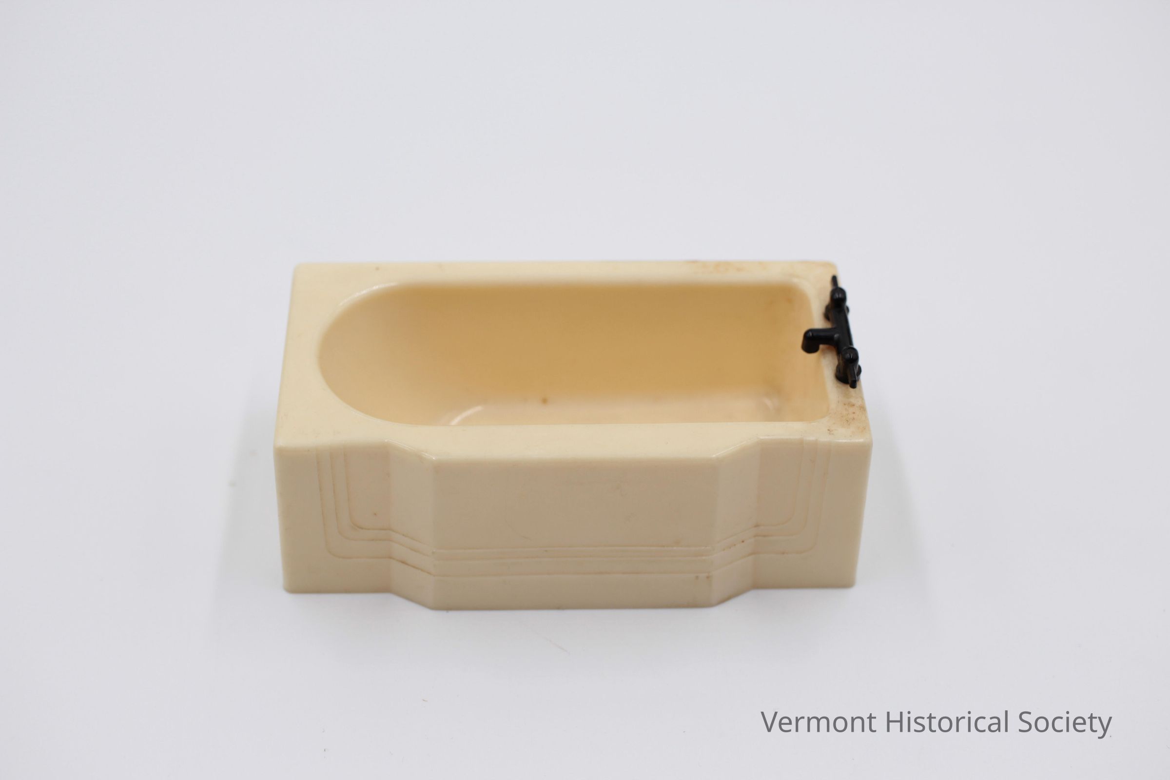 Miniature plastic bathtub with straight exterior sides and a black faucet and handles. The bottom of the tub is molded with the words, "Made in U.S.A. / No.T 95 / A Renwal Product / Pat. Pend. U.S.A. & Canada".Context