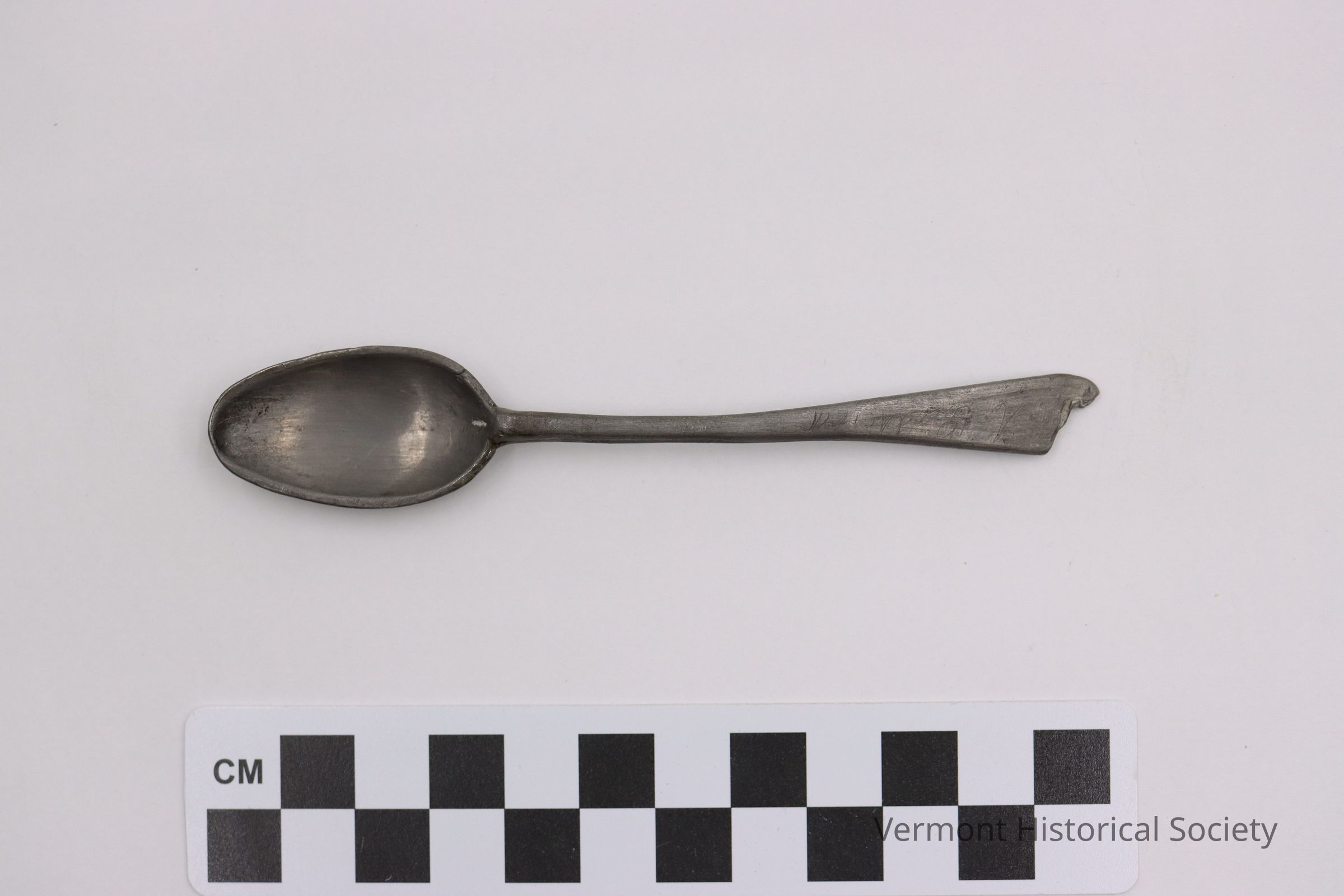 Small pewter spoon. The handle is scratched with the inscription, "S. A. Goddard". The tip of the handle is clipped off.