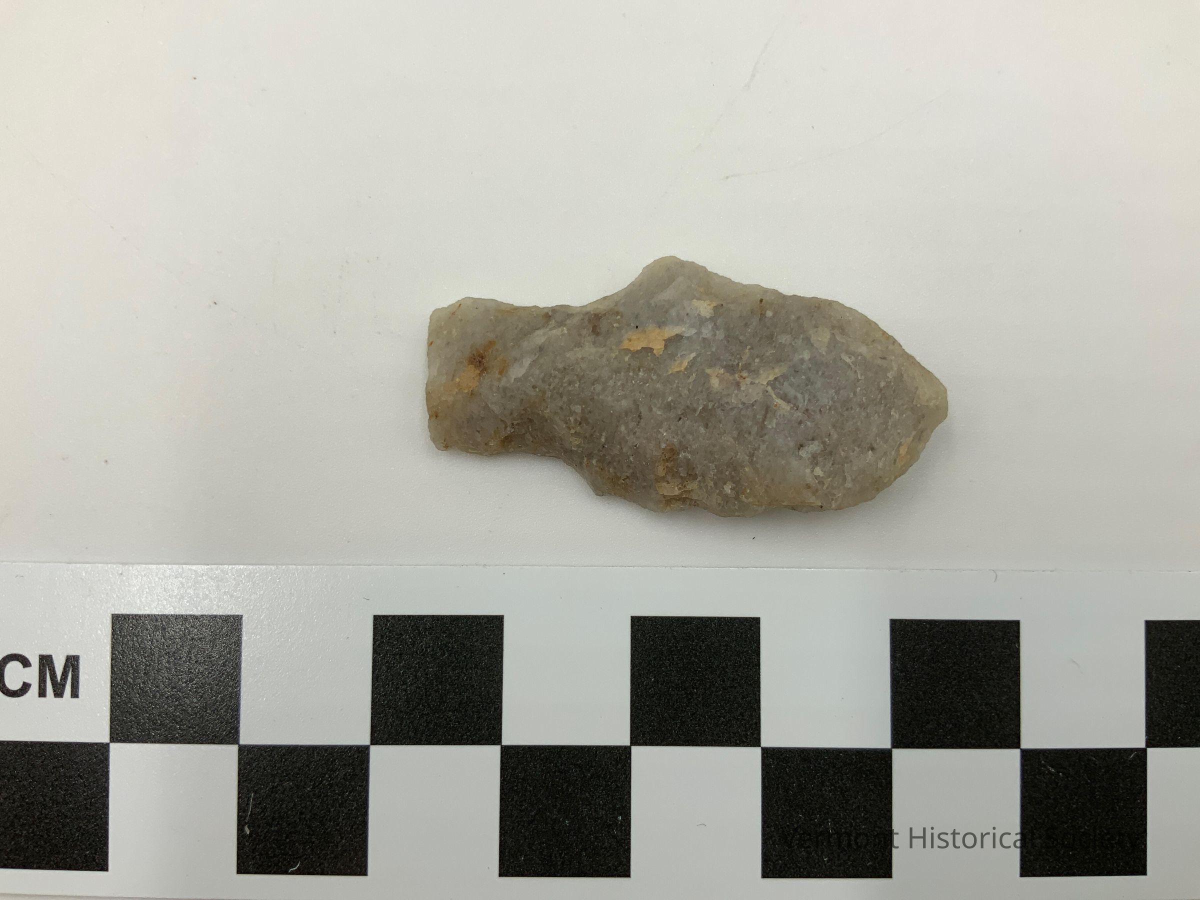 Light grey chipped stone projectile point with a straight stem. The base is not thinned.