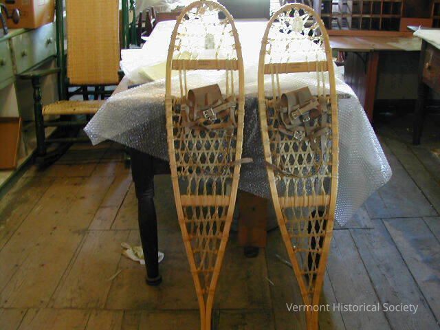 Tubbs snowshoes, style "Cross Country, 10 x 46". See page 16 of the catalog. Rawhide lacing, neoprene bindings (page 18 of catalog). The bindings are made up of straps that enclose the bood with a wide flap that comes up over the toe of the boot. Bent wooden frame pinned at end.