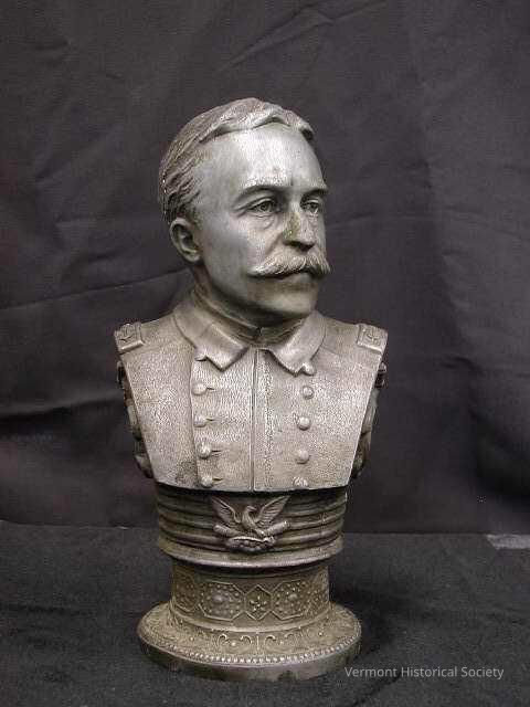 Silver-painted portrait bust of Admiral George Dewey. He has a large mustache, and his hair is parted in the center. He is wearing a double-breasted military coat with rectangular epaulets. The round base is molded with a flying eagle and architectural decorative elements.Artwork Details