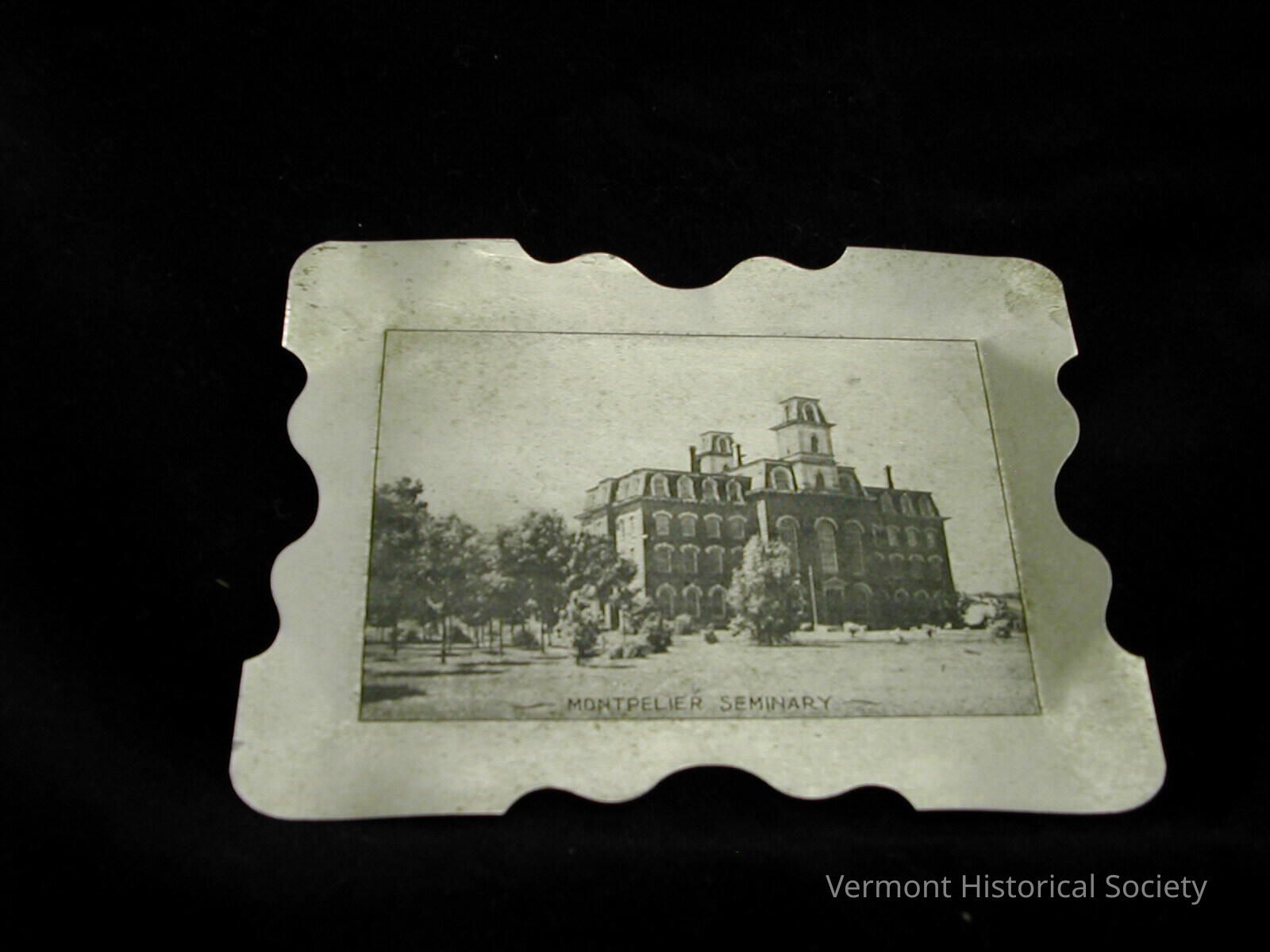Rectangular, stamped-metal ashtray that has scalloped edges. It features a photo of a large building that is printed onto its surface. The photo is labeled "MONTPELIER SEMINARY."