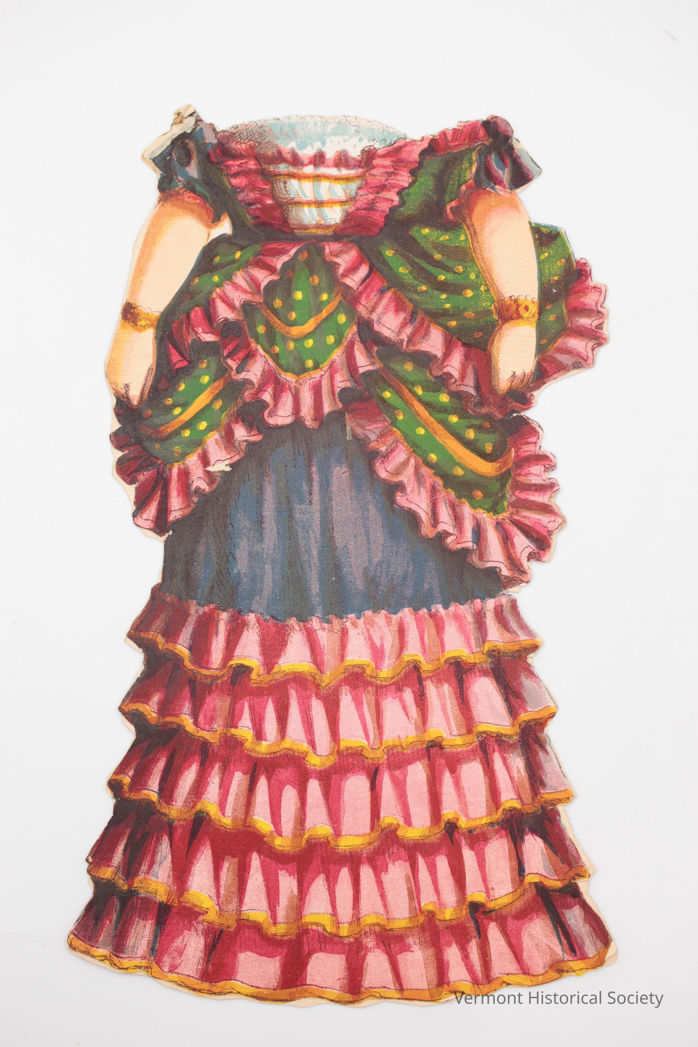 Two-sided paper doll dress. The dress has a green bodice and bustle trimmed with pink ruffles, and a blue skirt with five tiers of pink ruffles. The back shows that the bustle is tied with a yellow ribbon. The two sides are connected at the shoulder to fit over the doll.Acquisition