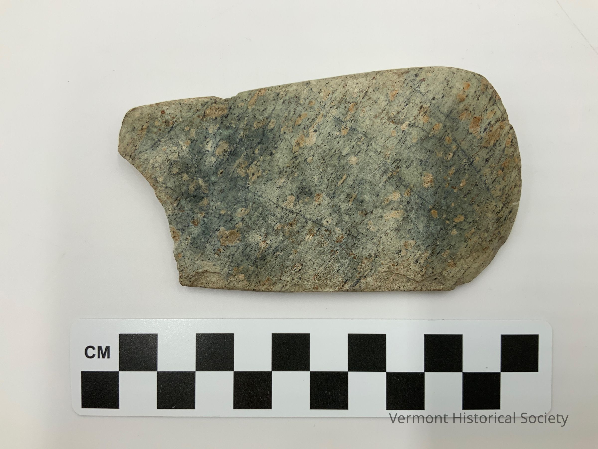Ground stone celt made of rhyolite. The entire item is ground and polished. One end curves inward, appearing to have been broken. The other end curves outward with a sharp polished edge that shows some use.Context