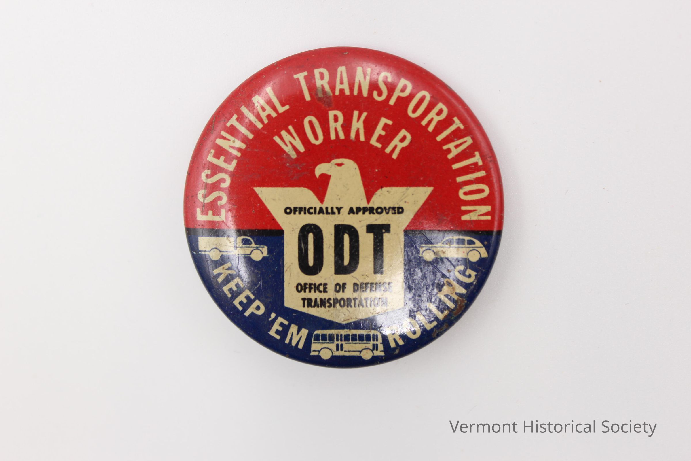 Round metal pin designating the wearer and essential transportation worker. The top half of the ground is red while the bottom is blue. The white inscription, "ESSENTIAL TRANSPORTATION/WORKER/KEEP 'EM/ROLLING", encircles the edge of the pin. The sections of the inscription are separated by small silhouettes of a truck, a bus, and a car. At the center is a white shield surmounted by an eagle head and the black inscription, "OFFICIALLY APPROVED/ODT/OFFICE OF DEFENCE TRANSPORTATION".