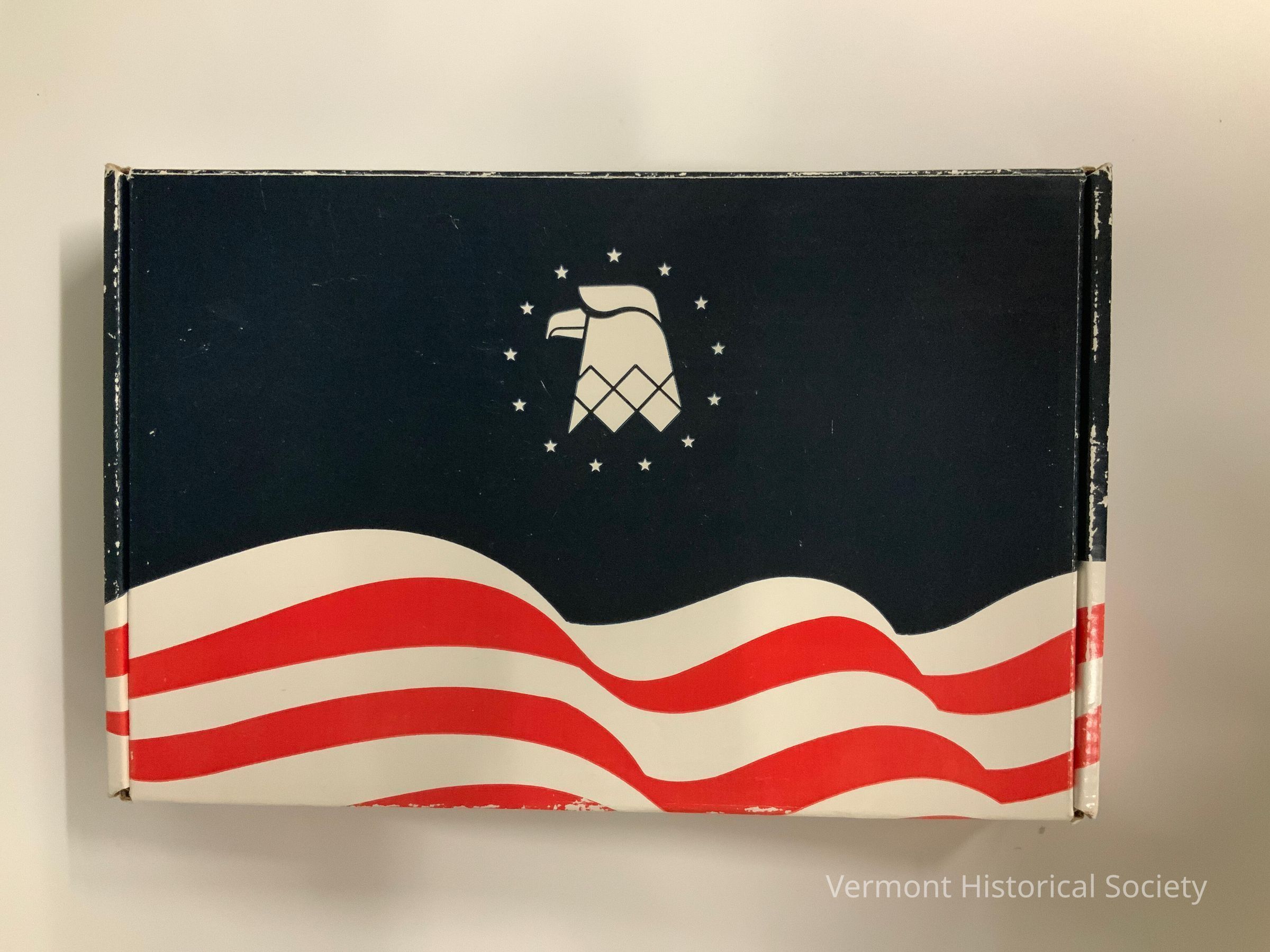 Cardboard retail box printed on the top in blue with a white eagle head, and on the bottom in wavy red-and-white stripes.Context