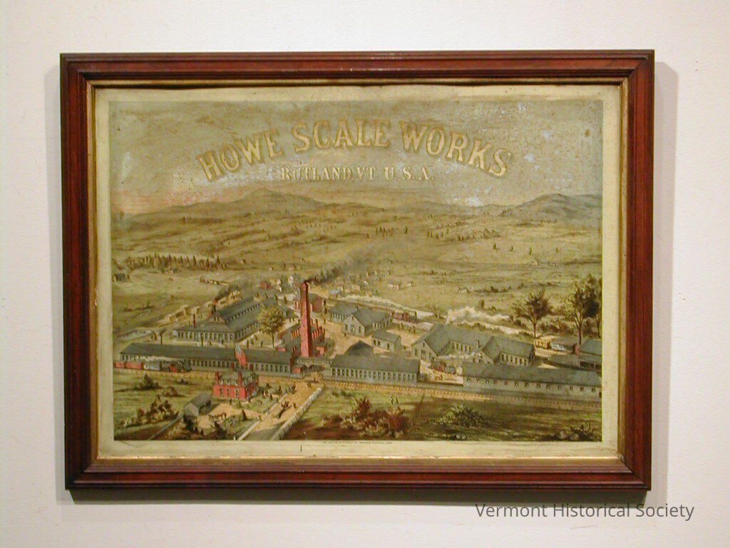 Print on tin showing a bird's eye view of a factory complex. The complex is set within a triangular block and consists of several blue or grey warehouses and a red factory with a tall chimney. The complex is bordered on two sides by railroad tracks, and there is an additional track inside the complex. There is a residential building in the foreground, a small village in the middleground, and grassy hills in the background. The words "HOWE SCALE WORKS / RUTLAND, V.T. U.S.A." are in the sky.Artwork Details