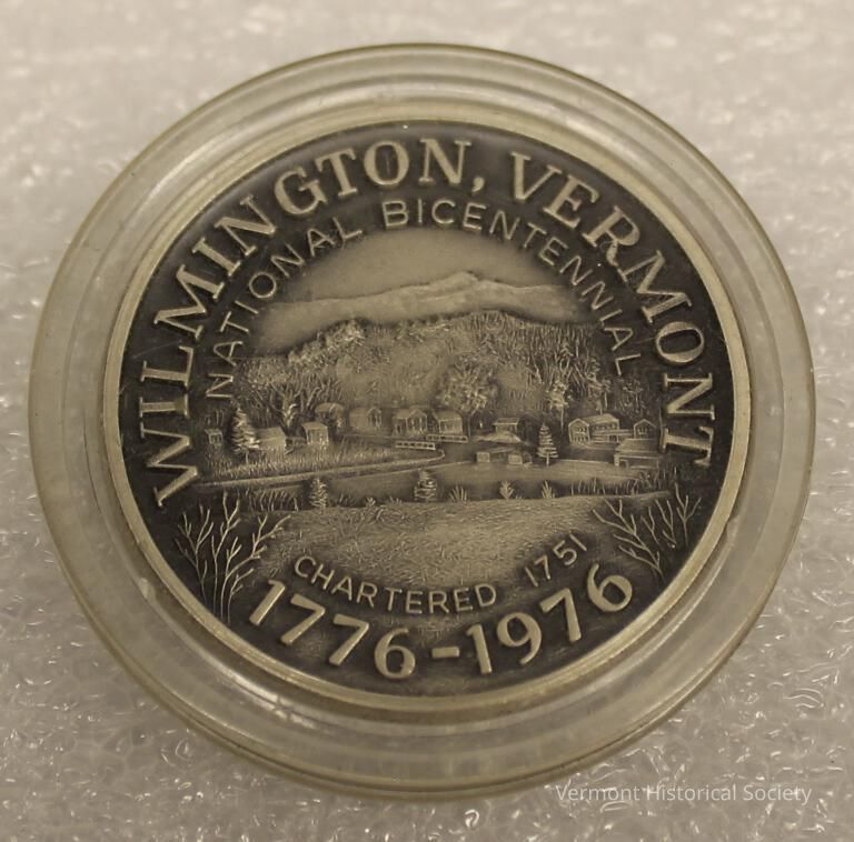 Sterling silver commemorative medal. One side shows a scene of several buildings around a road at the base of a mountain. The inscription, "WILMINGTON, VERMONT NATIONAL BICENTENNIAL CHARTERED 1751 1776-1976", rings the edge. The other side is separated into three wedges: one shows a church labeled, "BAPTIST CHURCH 1839"; one shoes a two-story building with an overhanging roof labeled, "TOWN HALL 1879"; and one shows a two-story clapboard building labeled, "MEMORIAL HALL 1902".Context