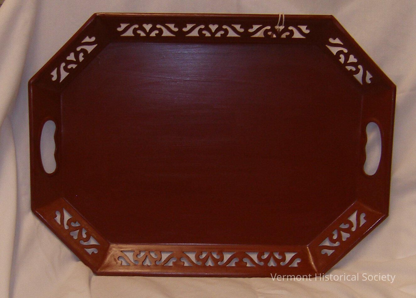 Red-painted metal tray. The tray eight sides, each with a raised edge that is pierced with a heart and scroll designs. Two of the edges have handles cut out of them.