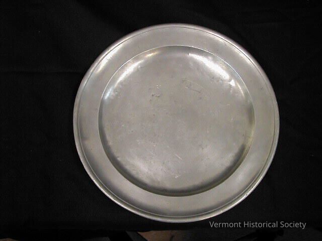 Pewter plate with the stamped label, "Richard.L", at the center back. The plate has deep well and a prominent rim.