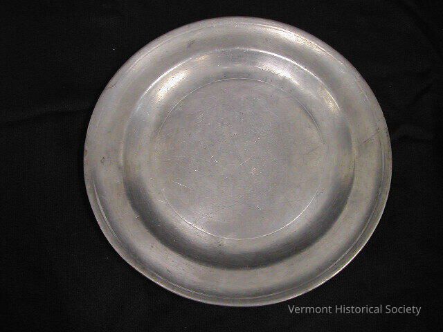 Pewter plate with an illegible stamped label. The plate has an incised line around the center well, a wide cheek, and a wide rim. The bottom is scratched with the name, "Sally Rice".