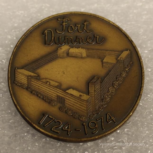 Bronze commemorative coin that celebrates Fort Dummer in Brattleboro, Vt. On the obverse is a depiction of the fort, with "Fort Dummer" at the top and "1724-1974" below. On the reverse is a flag on the top of a pole with an outline of the state of Vermont on the left side and a star in the lower right corner showing Brattleboro. Words to the right read "Fort Dummer, 1724, Pioneers then, Leaders now."Context