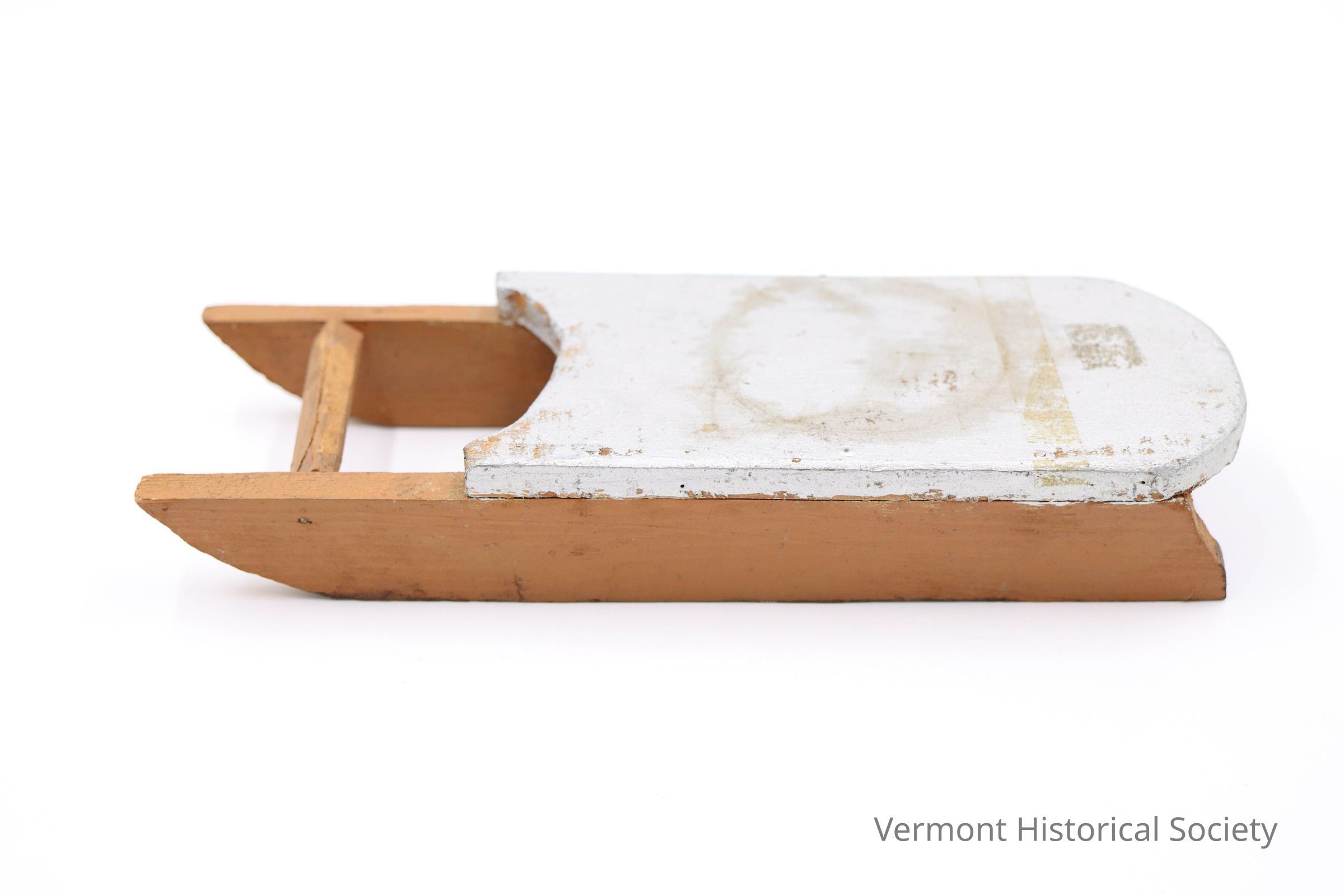 Miniature wooden model of a sled consisting of fixed wooden rails and a silver-painted wooden board on the top.