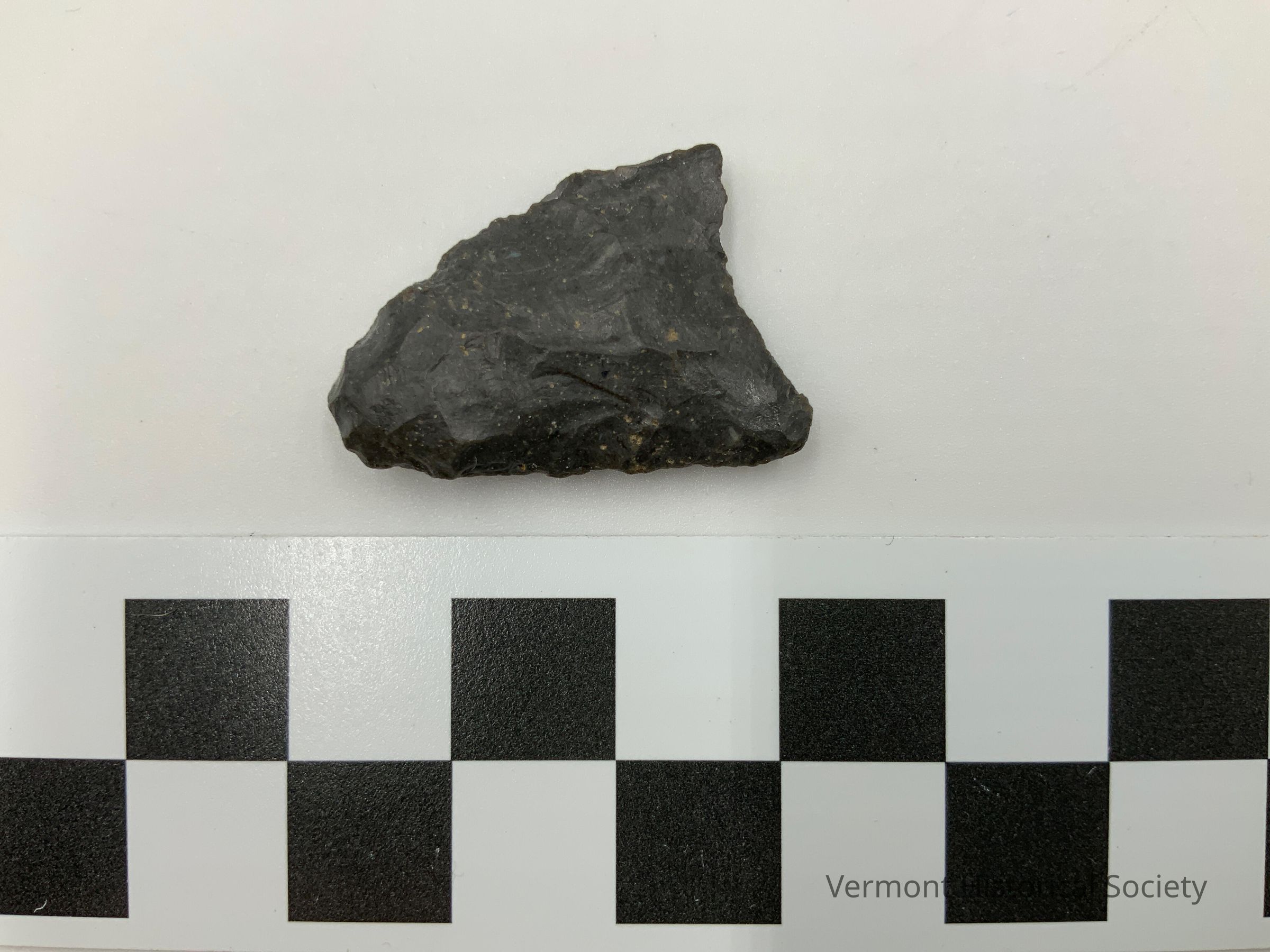 Triangular gray chipped stone projectile point. One edge is straight, one edge curved slightly outward, and the other edge curves inward. The point is rounded.Context
