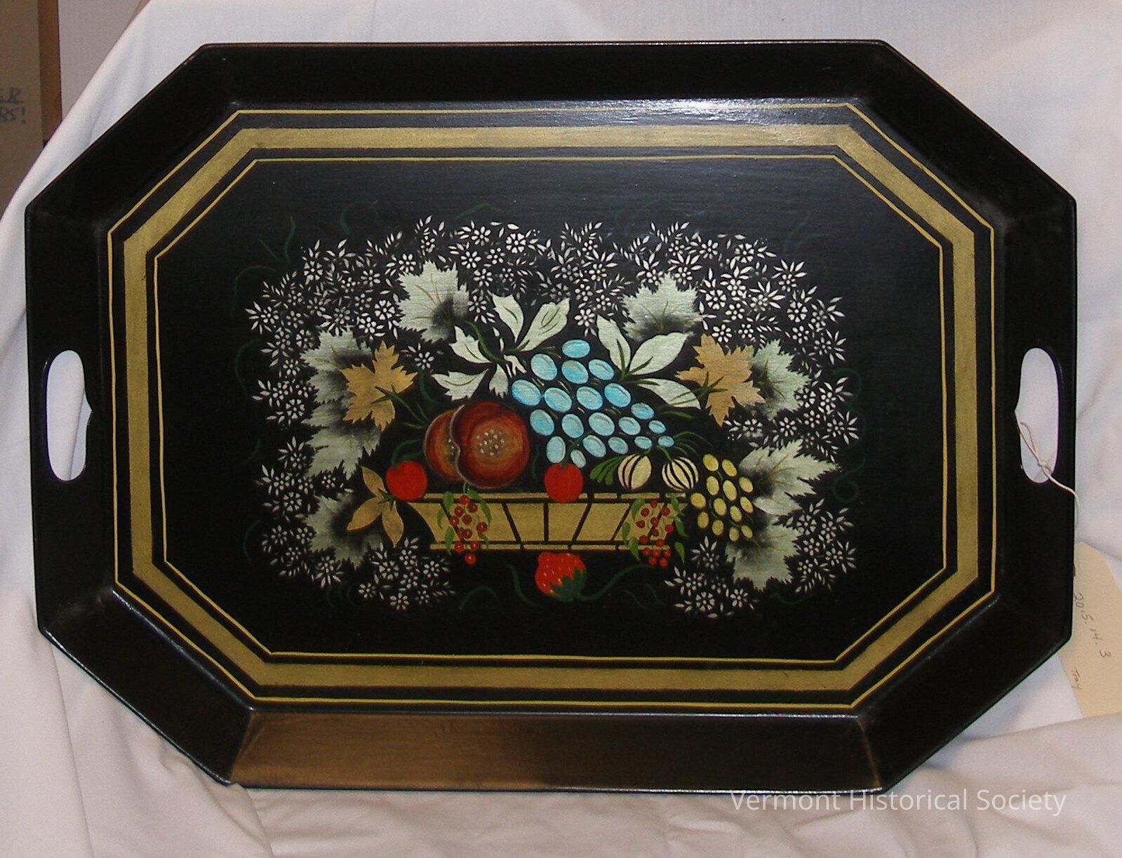 Black-painted metal tray with raised edges. The center of the tray is stenciled with a theorem design of a basket filled with fruit and leaves, including blue grapes, miniature melons, strawberries, apples, cherries, and oak leaves. The image is surrounded by tiny white flowers and leaves. The shoulder of the tray is edged with three lines of gold paint. The bottom of the tray is marked with the initials EFC scratched into a small circle of gilding.Context