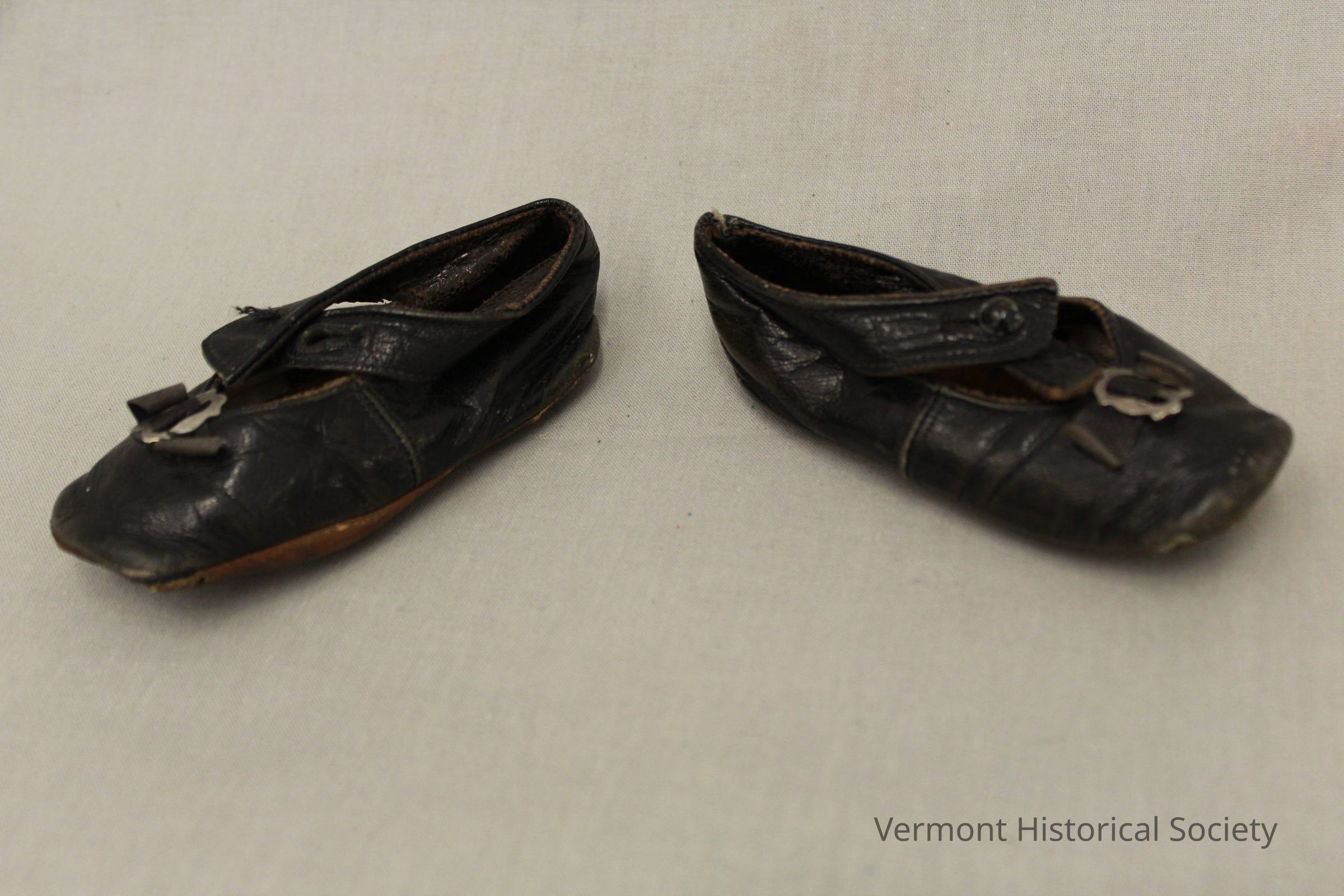 Black leather shoes sized for a small child. They buckle around the ankle in a Mary Jane stile. There is a decorative bow with a metal buckle at the toe.