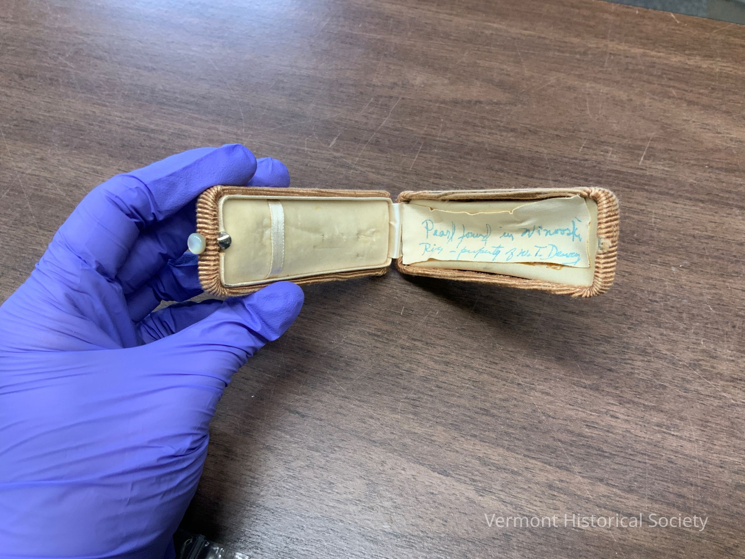 Narrow, corduroy covered box. The interior of the box is lined with velvet and satin, and there is an pasted-in paper note that reads, "Pearl found in Winooski River - property of W. T. Dewey".