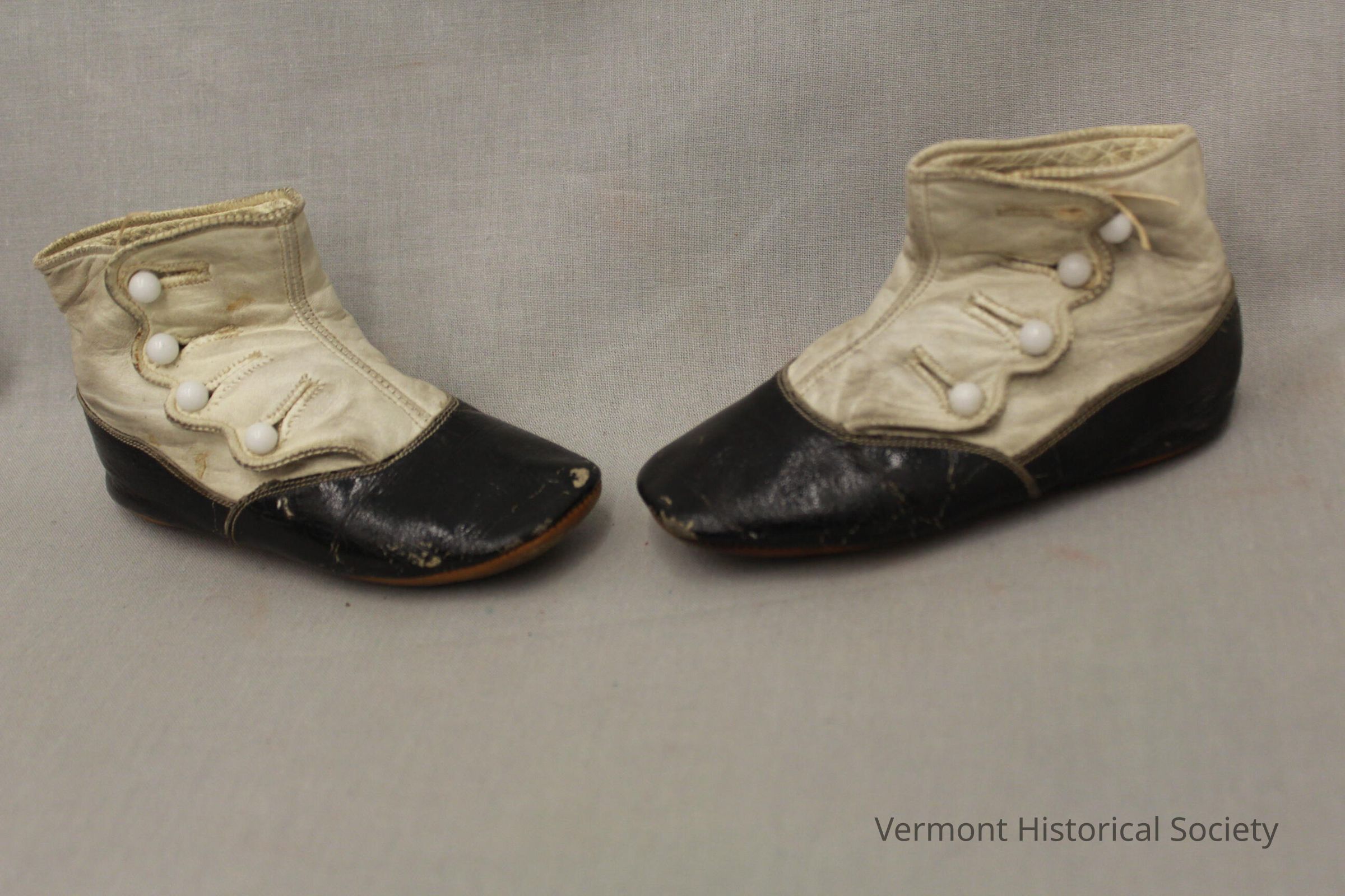 Black and white leather boots sized fora small child. The lower portion is black, white the portion that covers the ankle is white. They secure with 4 white buttons.