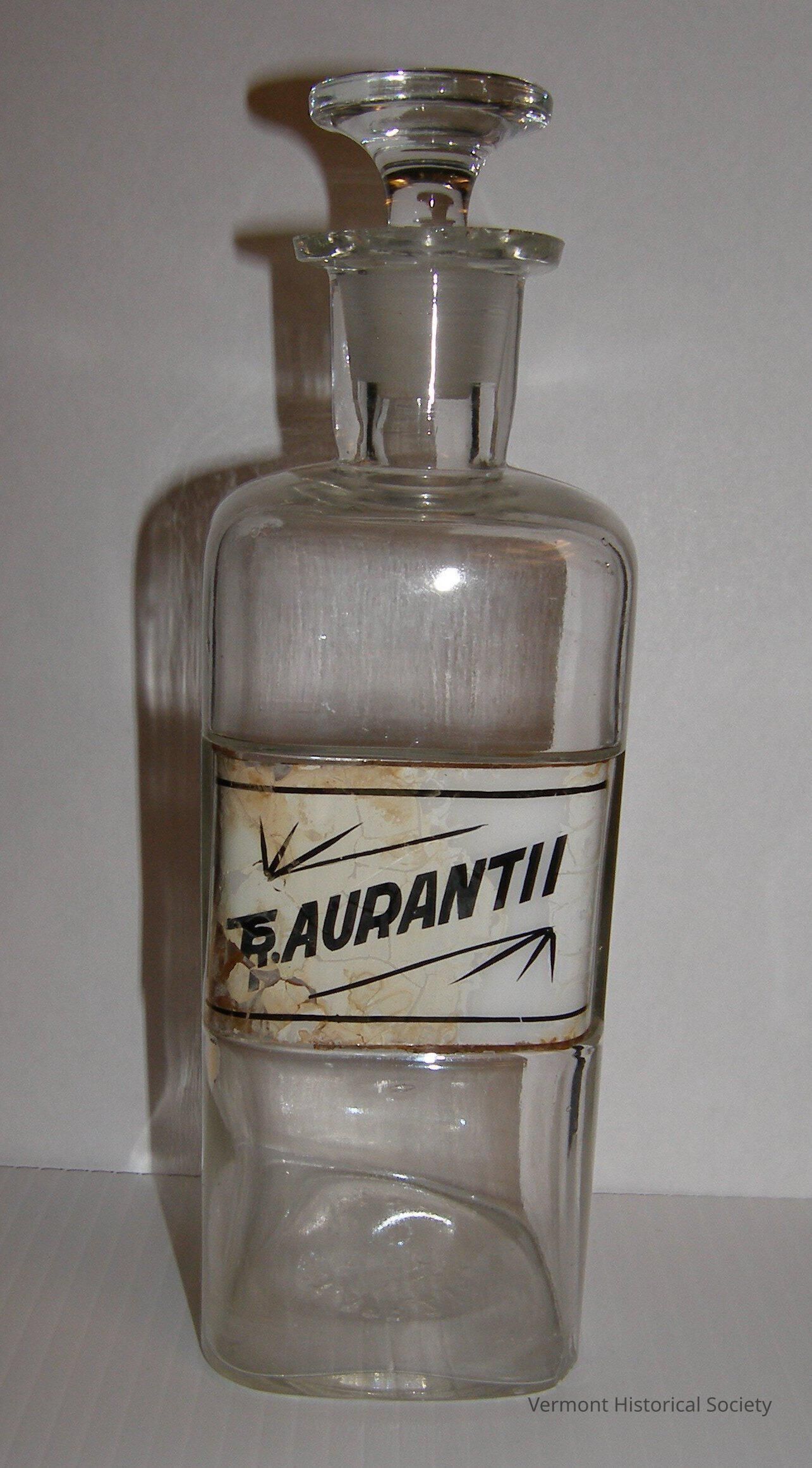 Clear glass apothecary bottle with a square base and a round, glass stopper. The front has a white ceramic label inset into the glass. The label reads, "Tr.AURANTII", between sunburst lines.Context