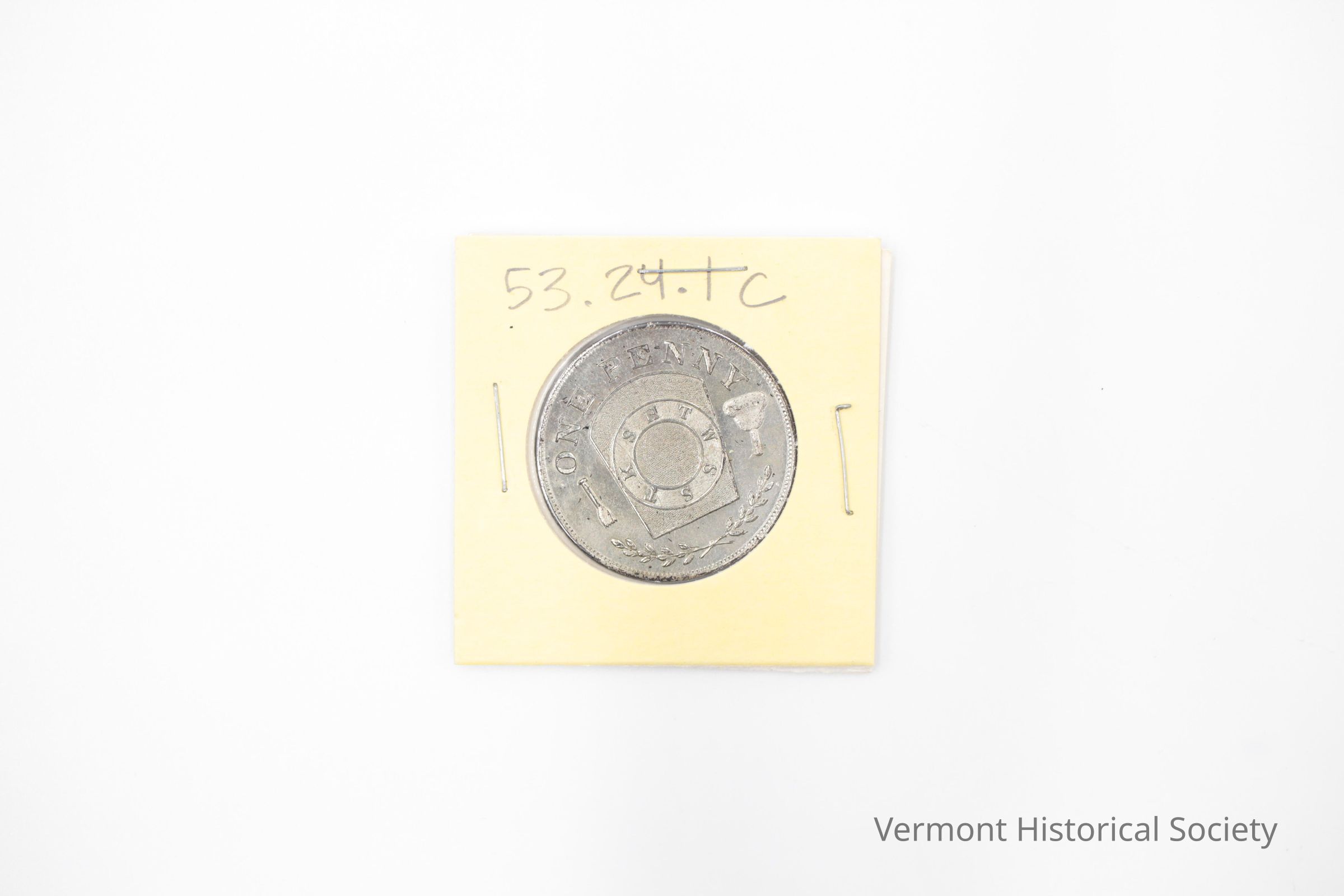 Silver-toned metal token with the words "ONE PENNY" on the obverse with an olive branch at the bottom, a tablet with a circle of initials "H T W S S T K S" in the center, a chisel, and a funnel. On the other side of the token are the words, "Cleveland Chapter No. 20 R.A.M. Newport, Vt.”Use