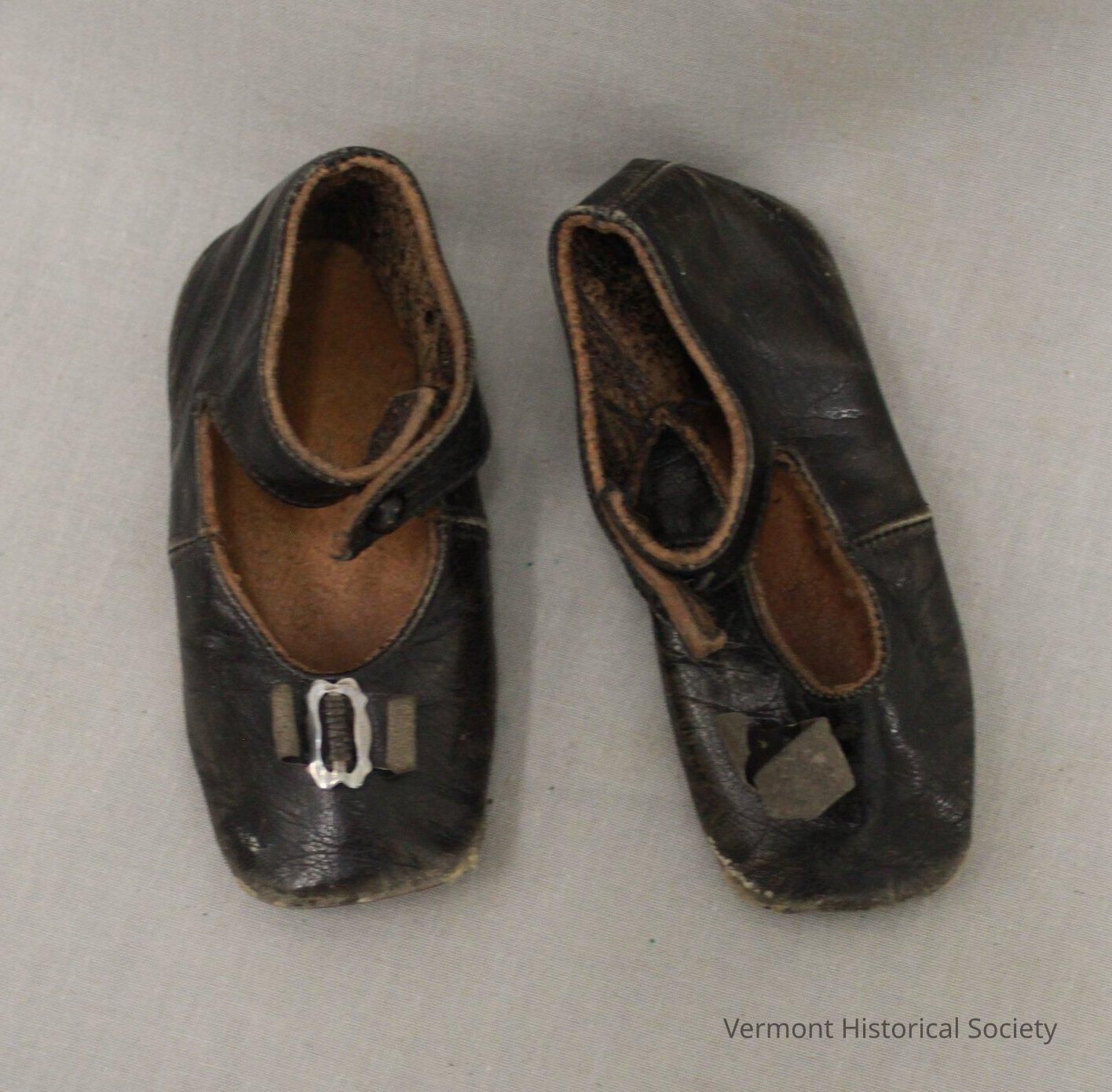 Black leather shoes sized for a small child. They buckle around the ankle in a Mary Jane stile. There is a decorative bow with a metal buckle at the toe.