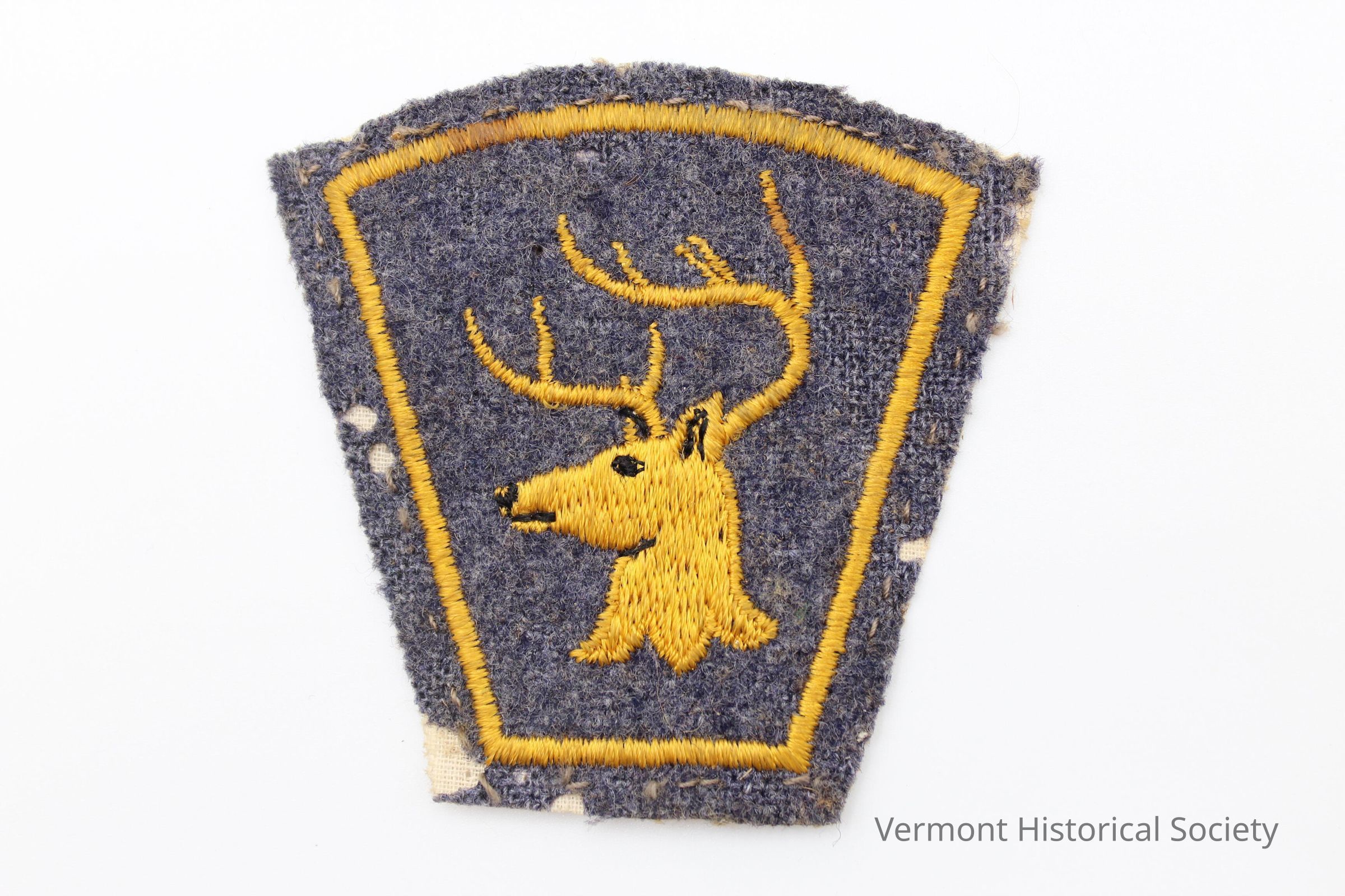 Grey, felted wool patch embroidered in yellow with a silhouette of a stag's head facing to the left.